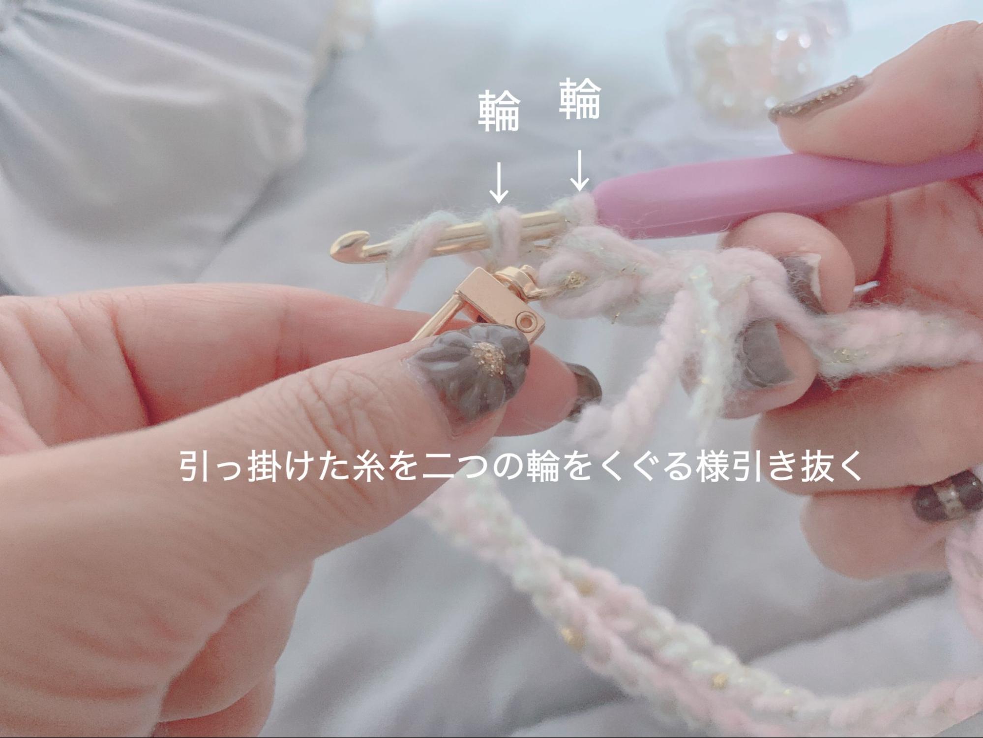 5.再び、毛糸を奥側から手前に向かってくるっと引っ掛ける。画像2枚目の様に、糸を引っ掛けたまま輪の中をくぐる様にかぎ針を引き抜く。
