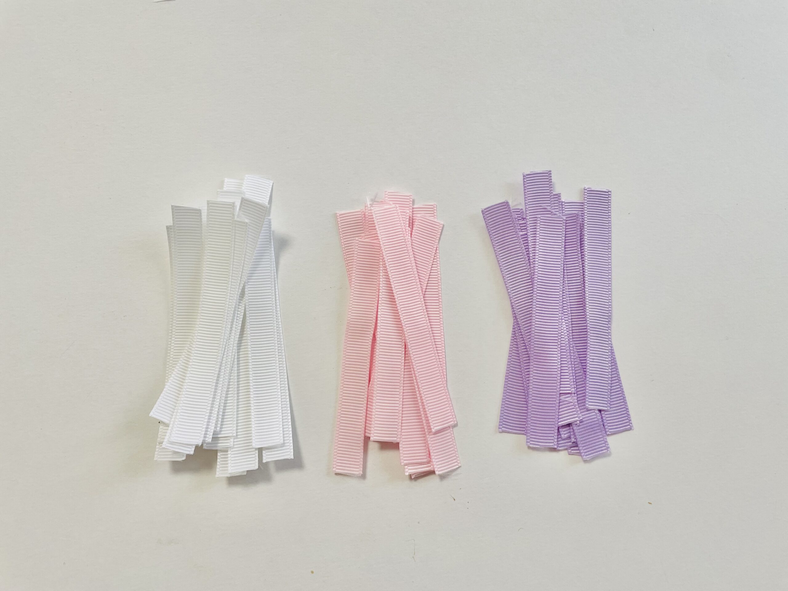 1種類のグログランリボンから16本作ることができます。3種類同じように切り、3種類合わせて48本使用します。