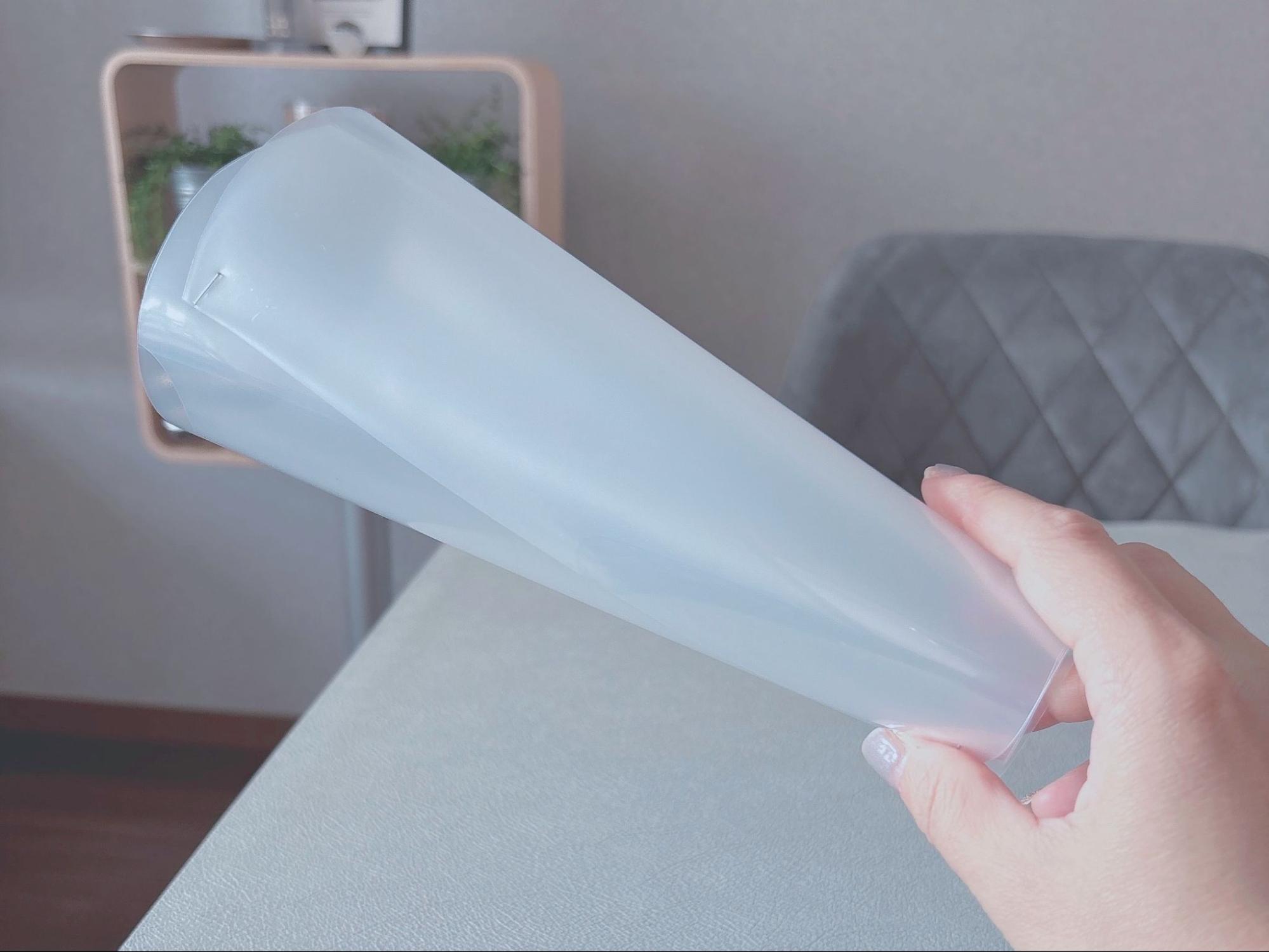 - クリアファイルをメガホンの形になるように、扇形をなんとなくでいいので左右対称になるように画像のようにカットしていく。この時、クリアファイルは切り離さず、表裏2枚重なった状態でカットしてください。(そのほうが強度が良いので)。