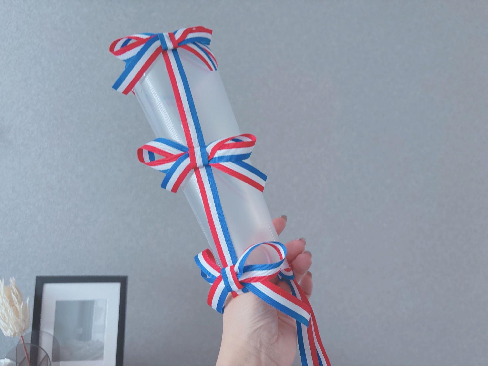 今回はオリンピックにちなんだリボンを使用しましたが、この方法でリボンを変えれば、部活動や体育祭の応援グッズや、ライブの推しグッズとしても活用できます。ぜひ、さまざまなリボンを使って試してみてくださいね♪
