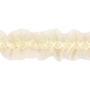 センターオーガンジーダブルフリルリボン #039(オフ)サイズの異なるナイロンオーガンジーを2枚重ねて、フリルを作りセンターで留めました。フリルが立体的に盛り上がっていますので、ボリューム感を出し、かつキュートな雰囲気を演出できます。フリルをサイドで留めたサイドオーガンジーフリルもあります。