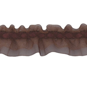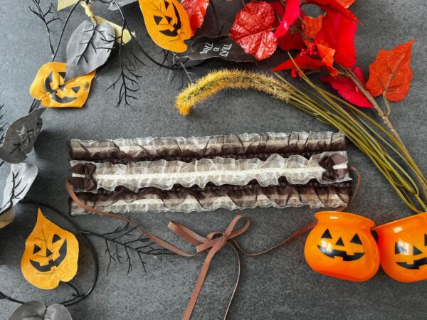 - 続いてサイドオーガンジーダブルフリルリボン36mm (茶色)をグルーガンで少しリボン同士が重なりそうな位置で留めていきます🎀