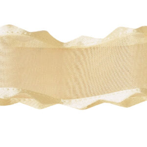 スカラップサテンオーガンジーリボン #133オーガンジーリボンの両耳(サイド)にサテン地を重ねて超音波で打ち抜きました。波型に型取りましたので、両耳(サイド)のサテンの光沢も十分に生かされ、シンプルでありながらスタイリッシュなリボンです。モダンにラッピング・デコレーションしたい際には役立つリボンです。
