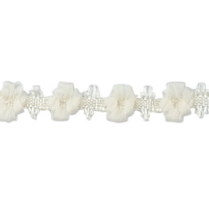 アクリルガーランドリボン #739(オフ)お花をモチーフにしたガーランド(花環)テープです。アクリルタフタリボンで花をイメージしました。ベースは、茎をイメージする緑と、純白なイメージの白の2種類から。またお花はアクリル糸を使用したビビッドな26色からお選び頂けます。オーガンジーを使ったガーランドもあります。