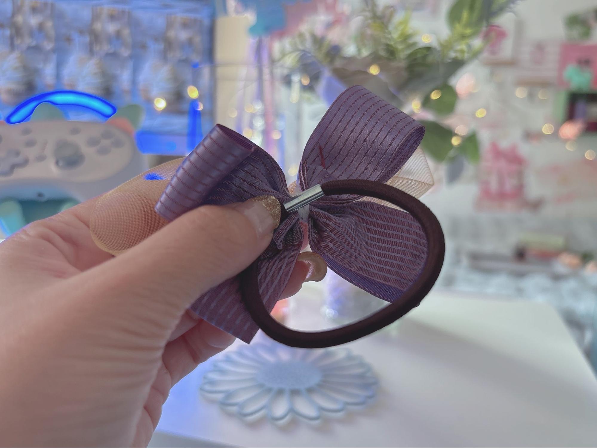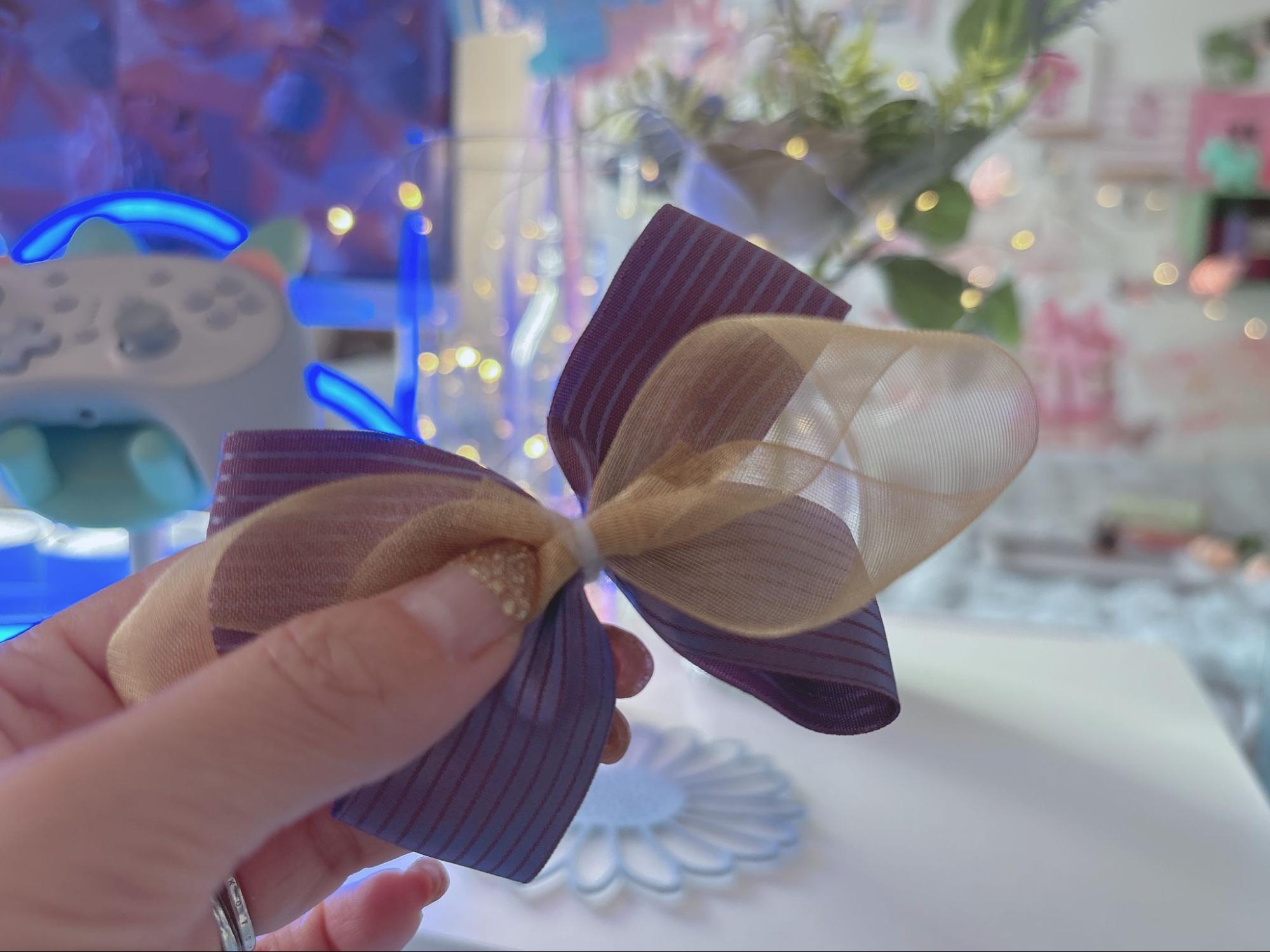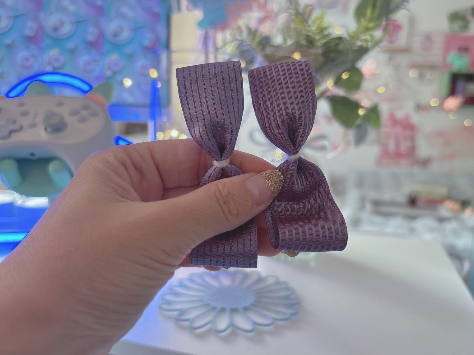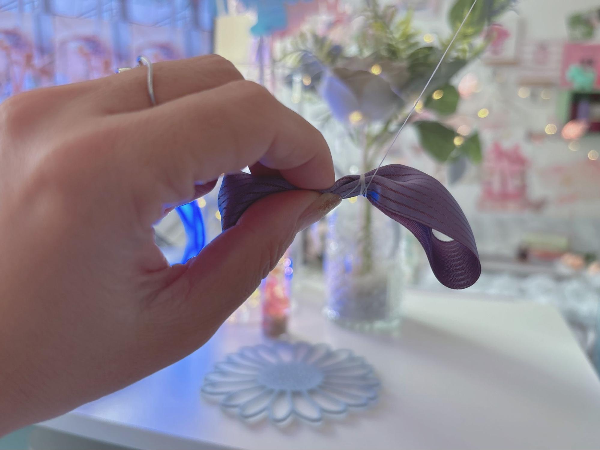 - パープルのリボン2個を画像のように二つ重ねて糸で固定します。