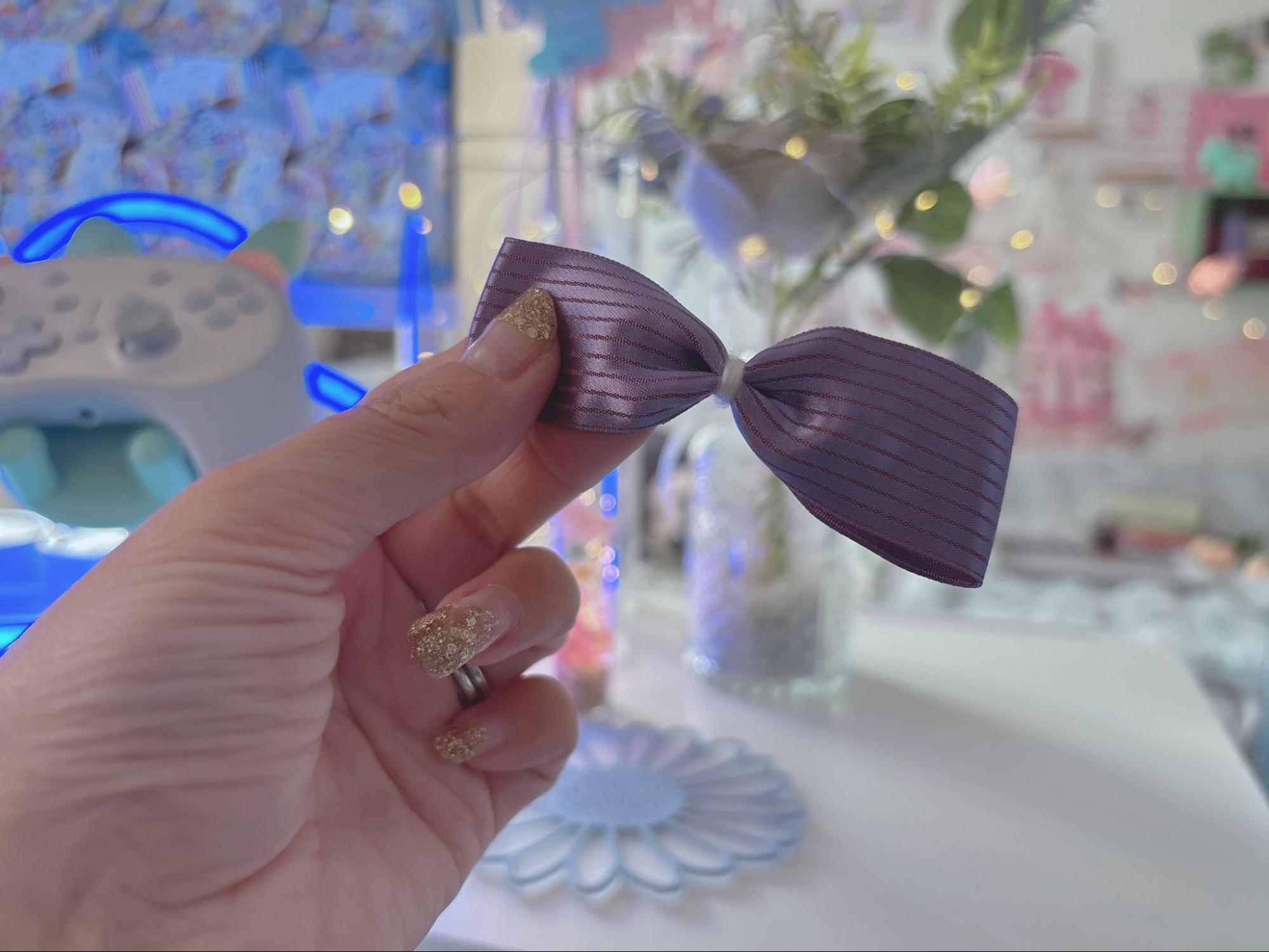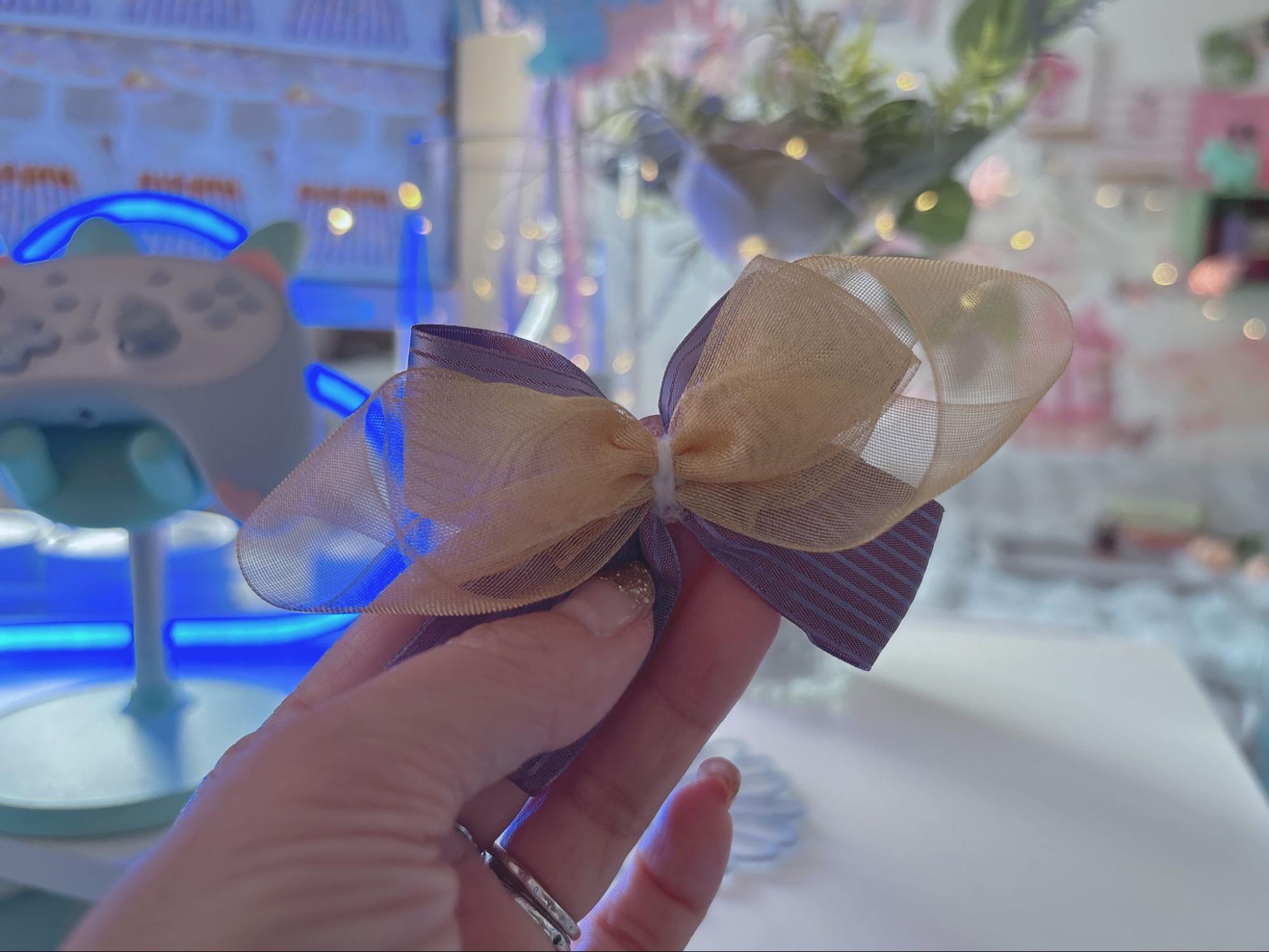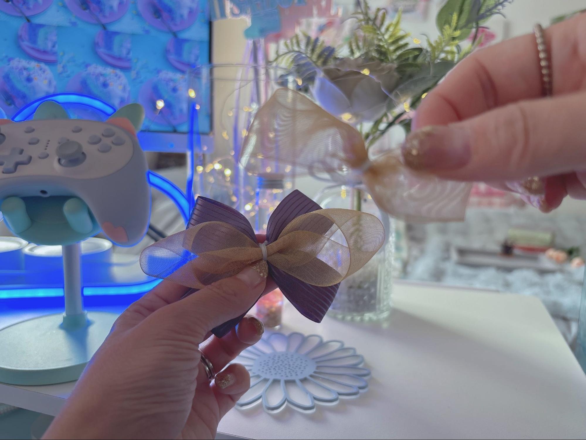 - パープルのリボン2個を画像のように二つ重ねて糸で固定します。