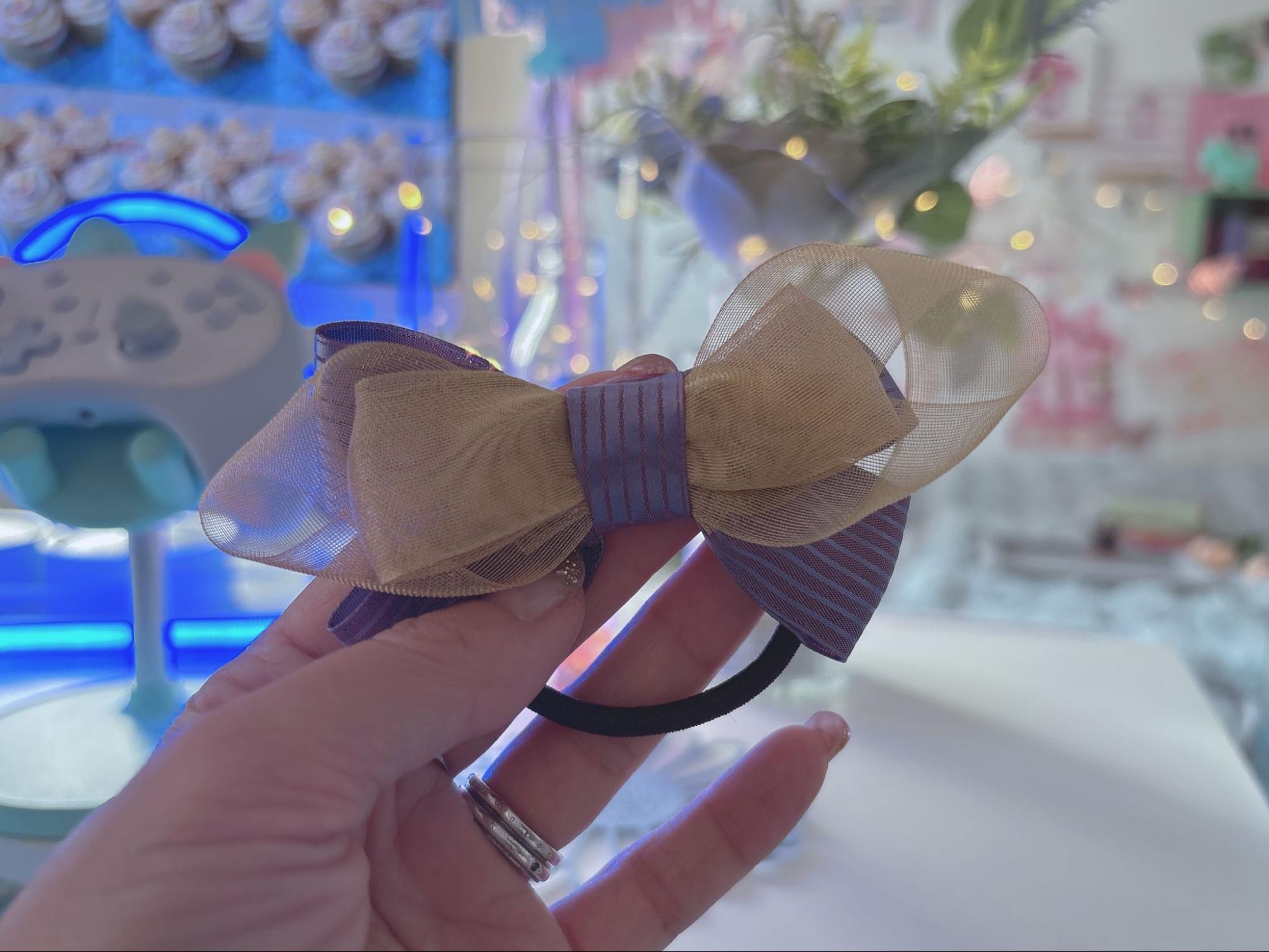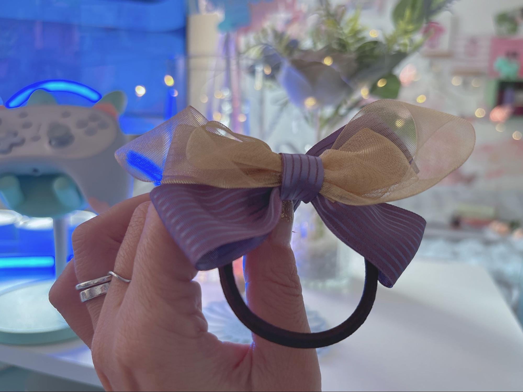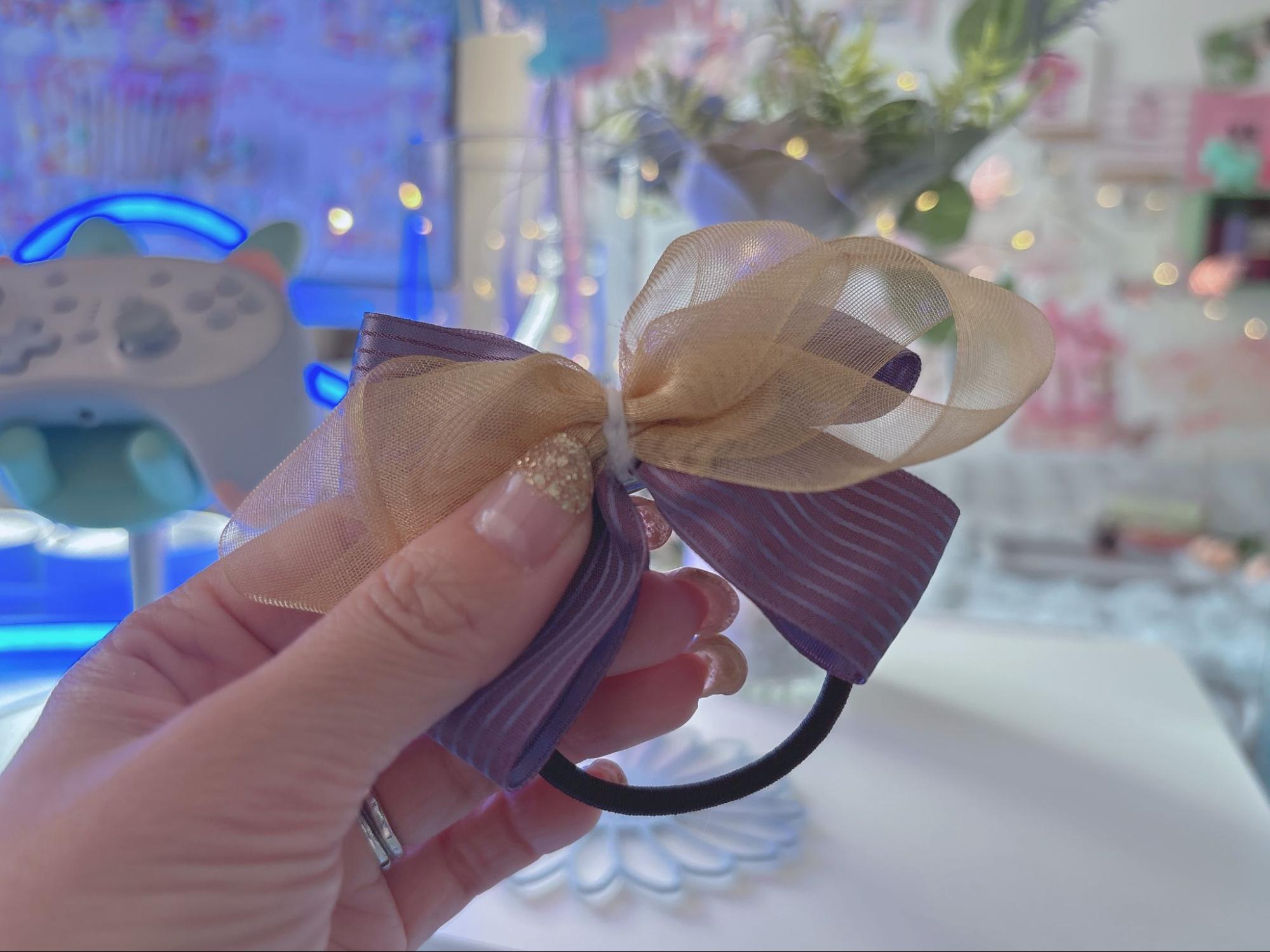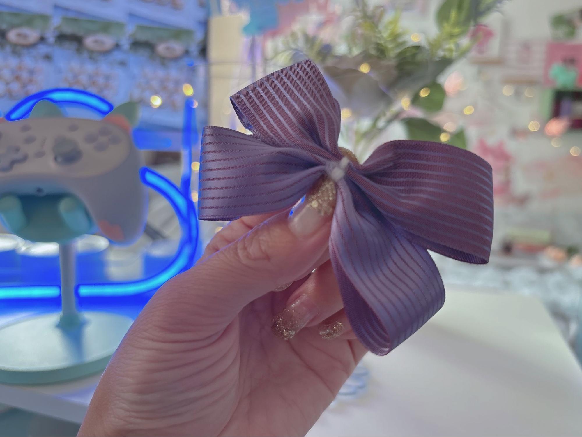 - パープルのリボン2個を画像のように二つ重ねて糸で固定します。
