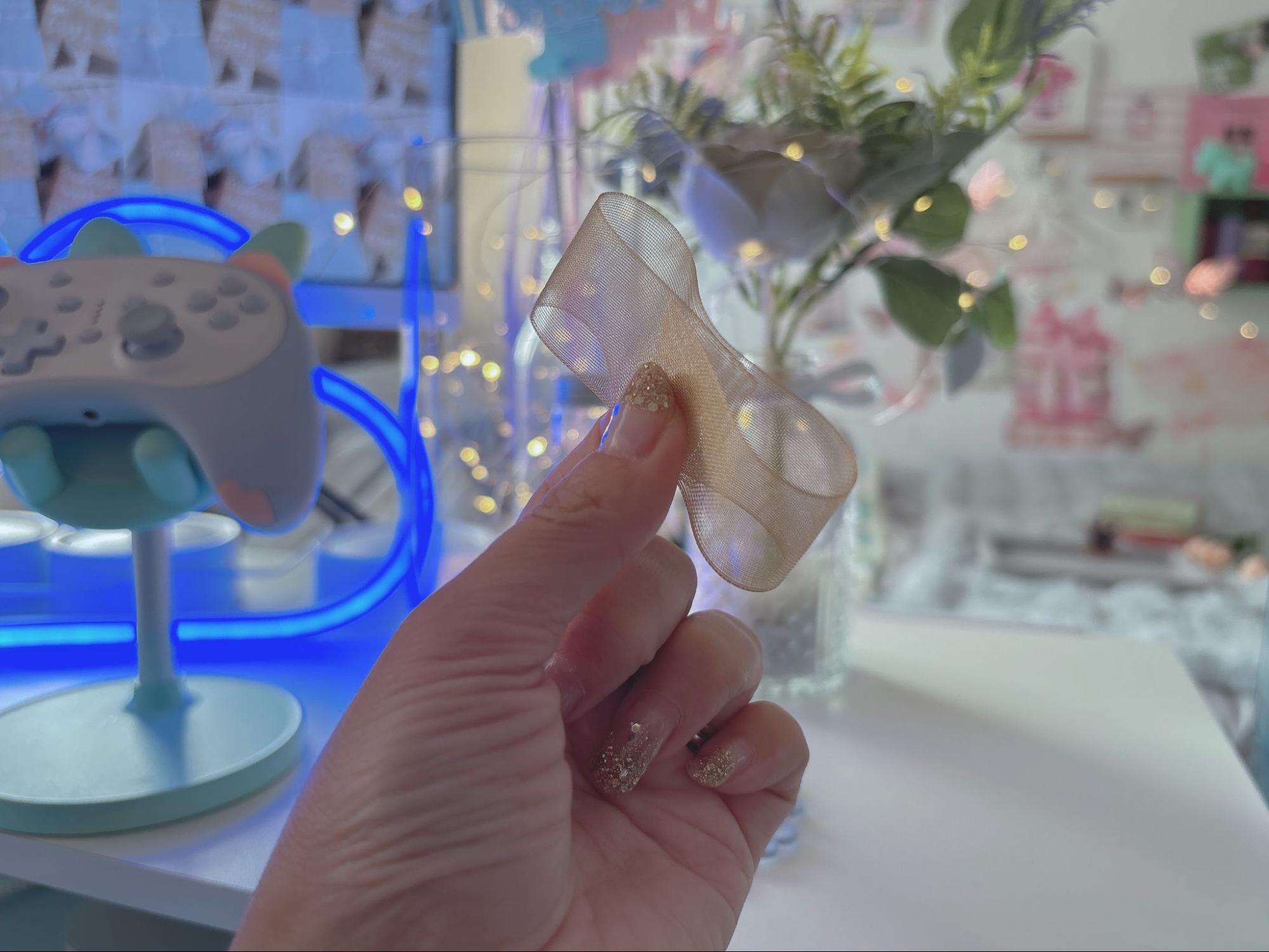 - リボン裏側にヘアゴムをあてます。糸で固定しましょう。