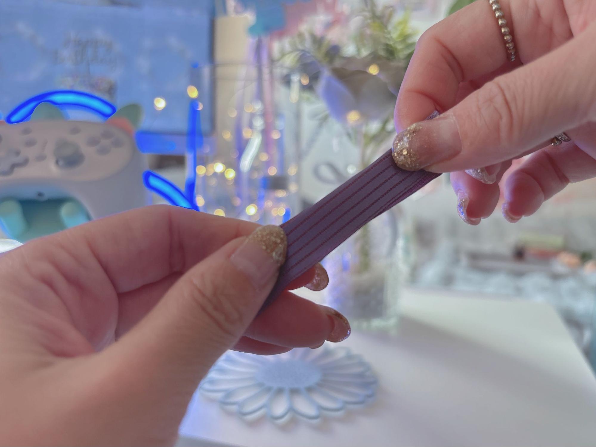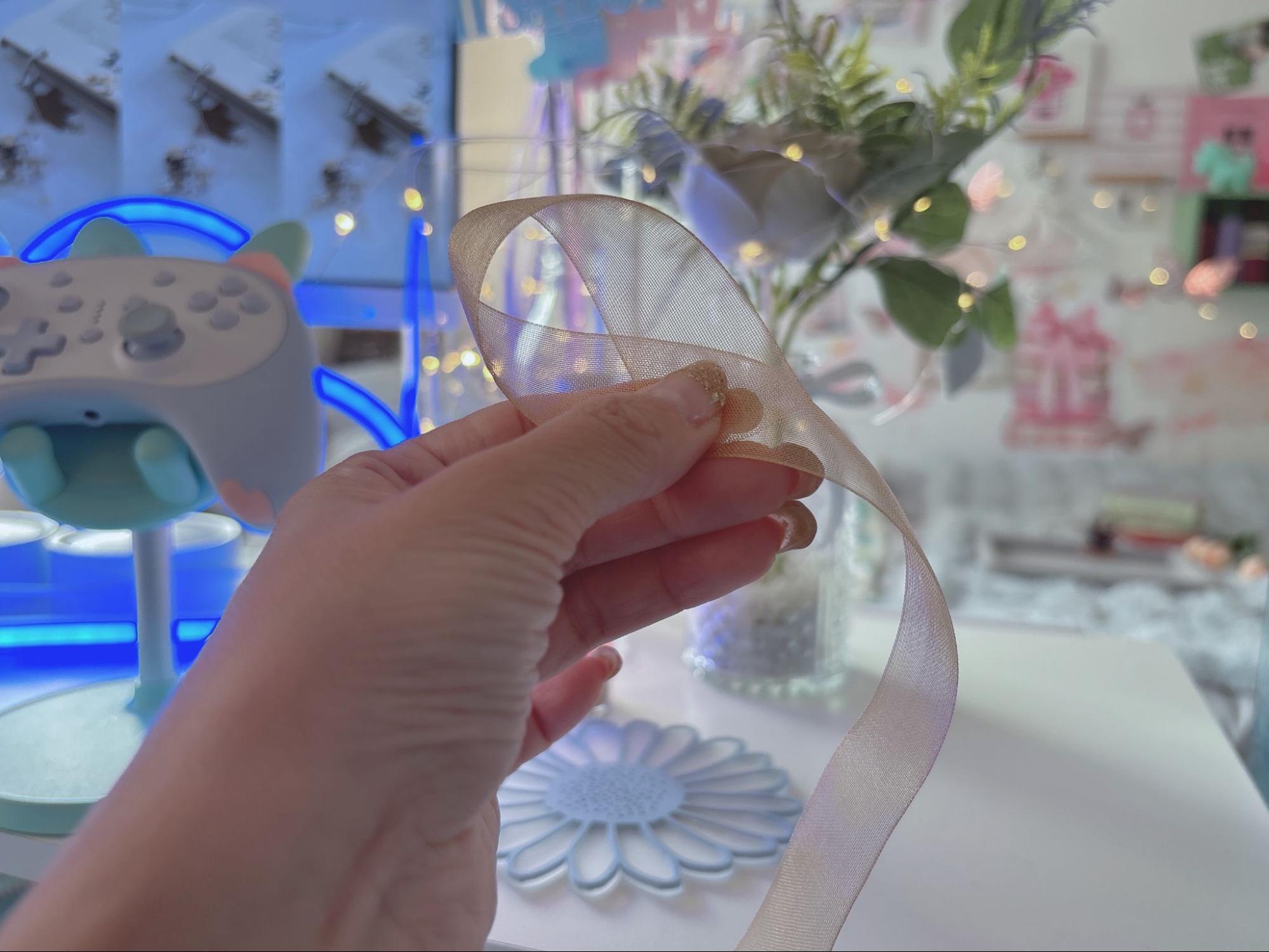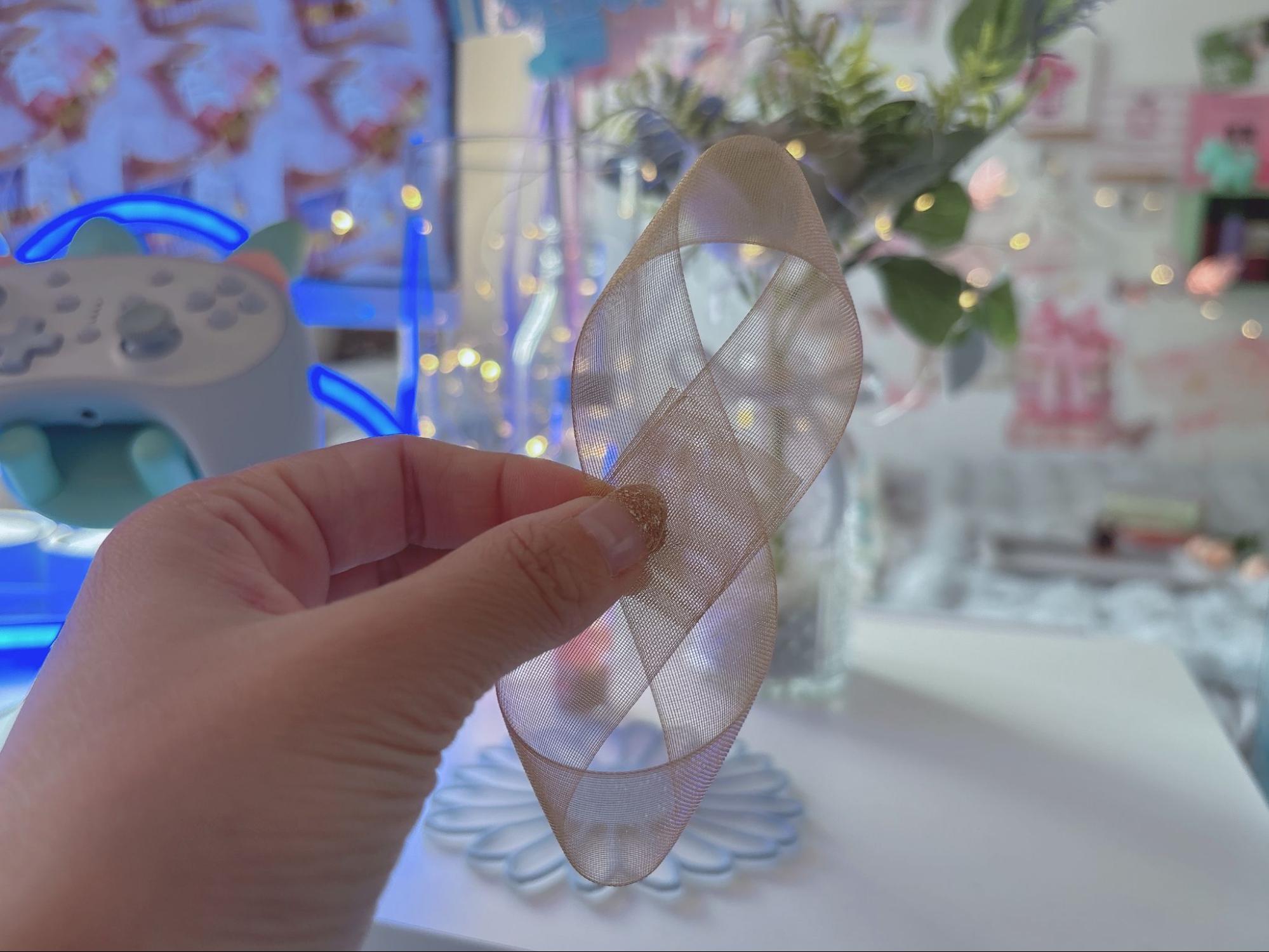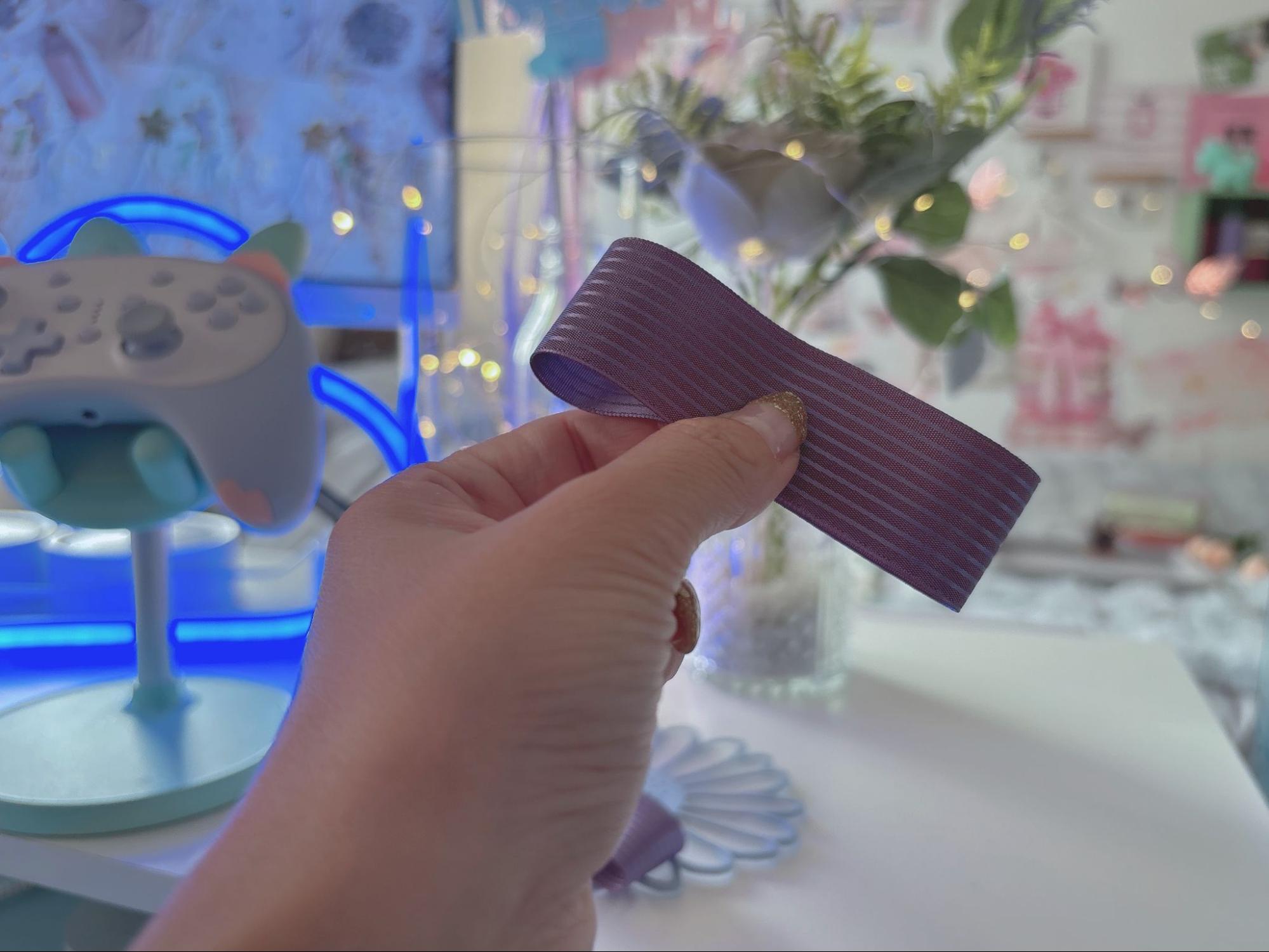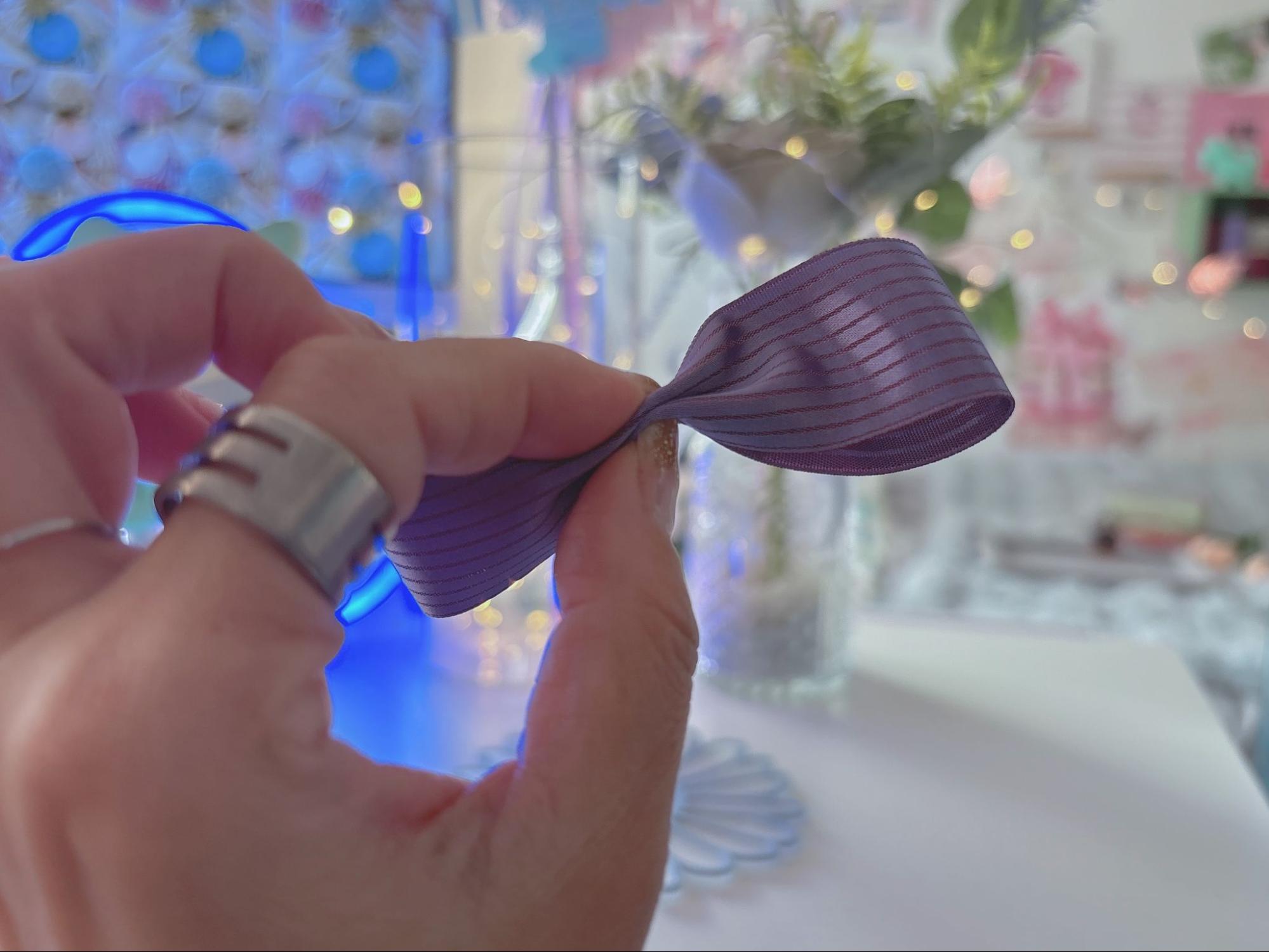- ペンタストライプシャンブレーリボンの22cmカットしたものを輪にします。