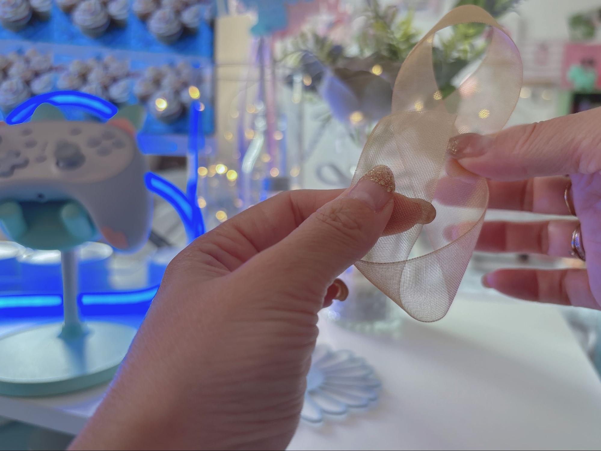 - リボン中央の糸を隠す作業に入ります。7cmカットしたリボンを縦半分に折りましょう。ぐるっとリボン中央に巻きます。グルーガンや接着剤でしっかり固定してください。