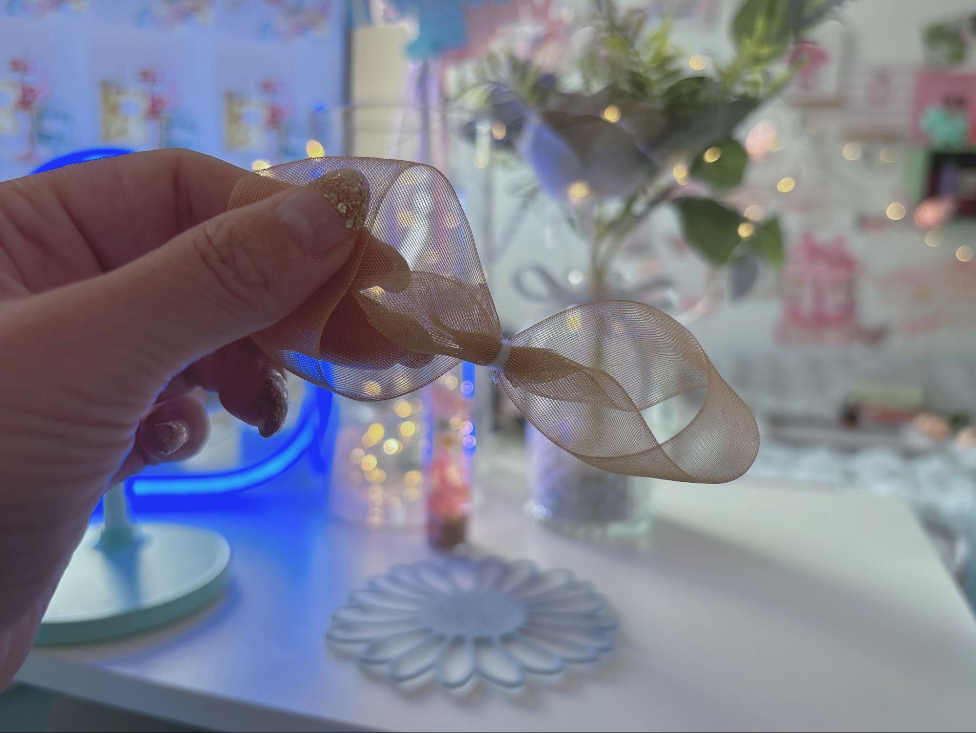 - 次に、メタリックオーガンジーリボンの27cmカットしたものをまず端から半分のところに輪を作ります。画像のように8の字を描くような輪を作ります。