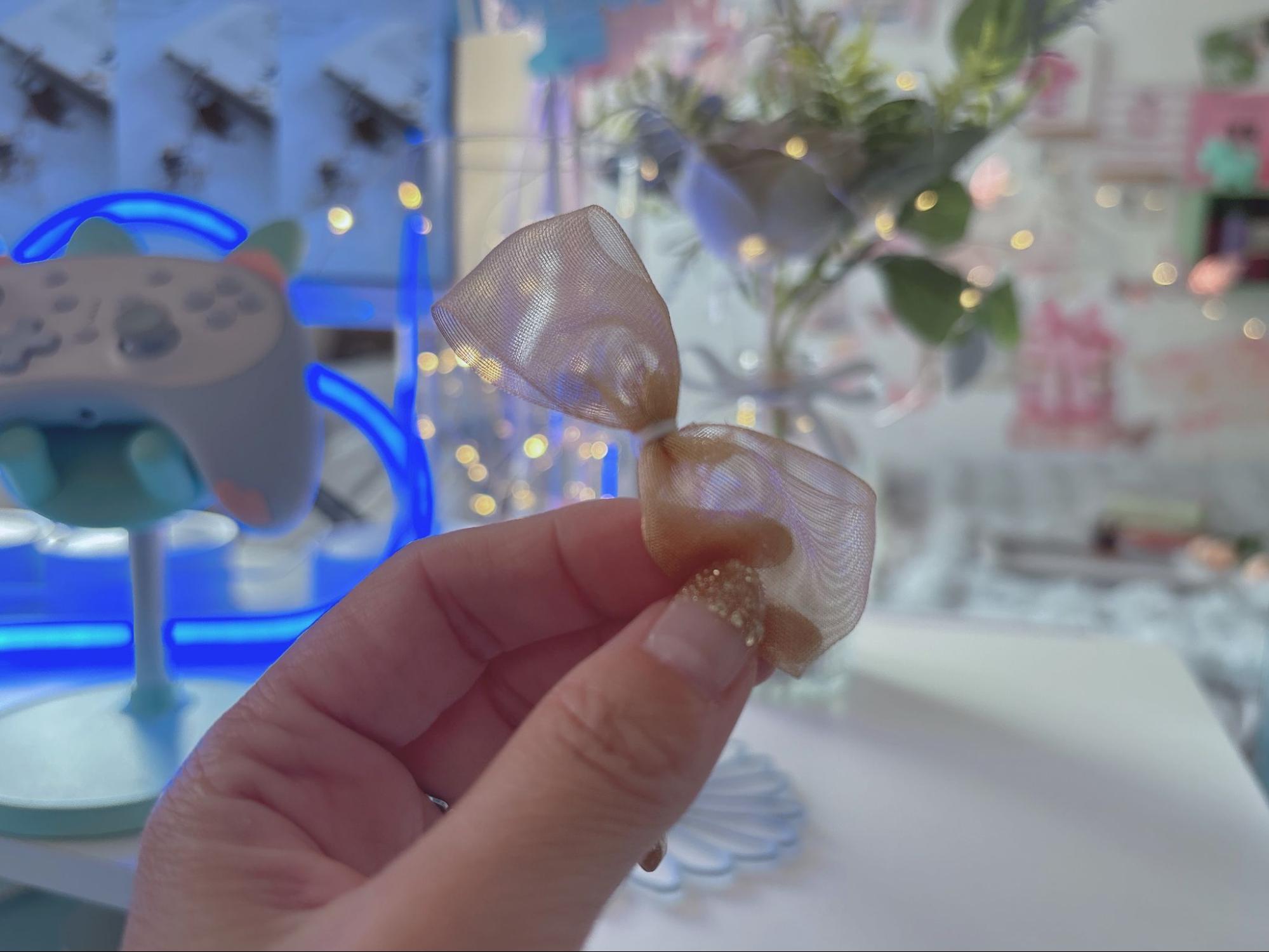 - さらに最後に5で作っておいたゴールドのミニリボンを中央に重ねて糸で固定します。
