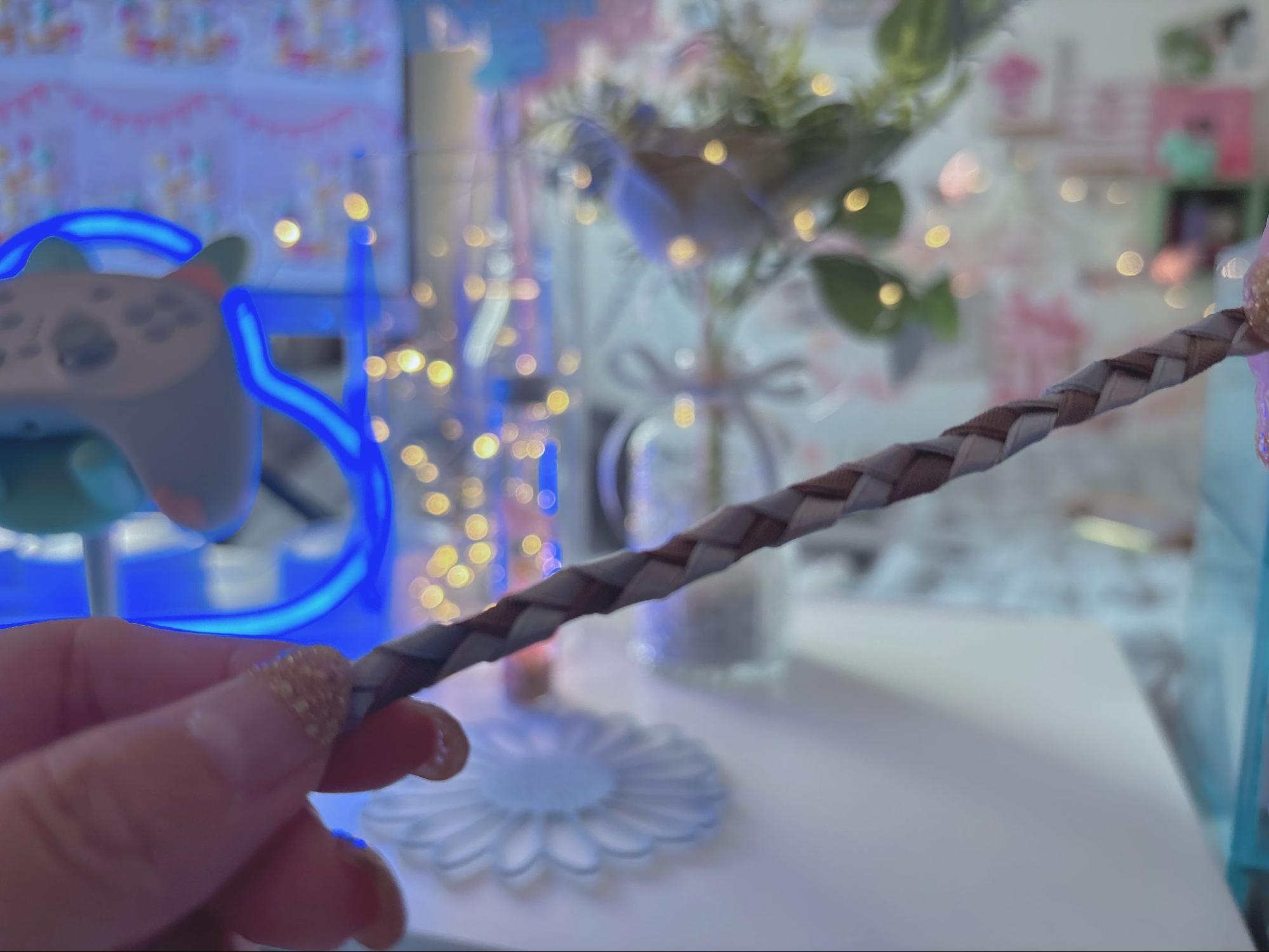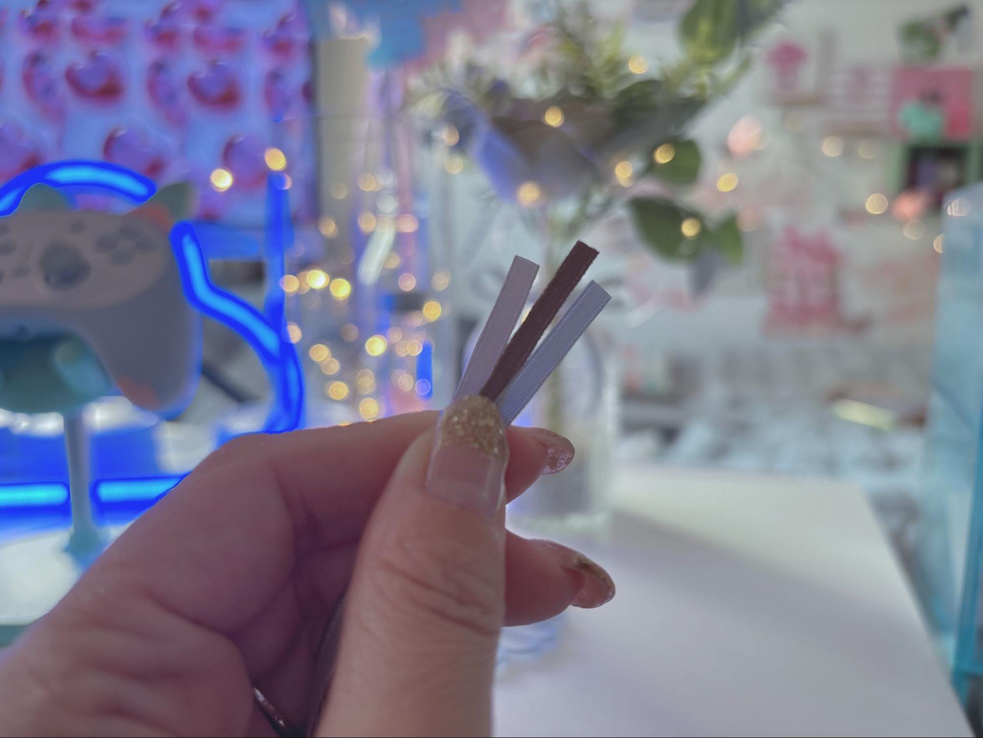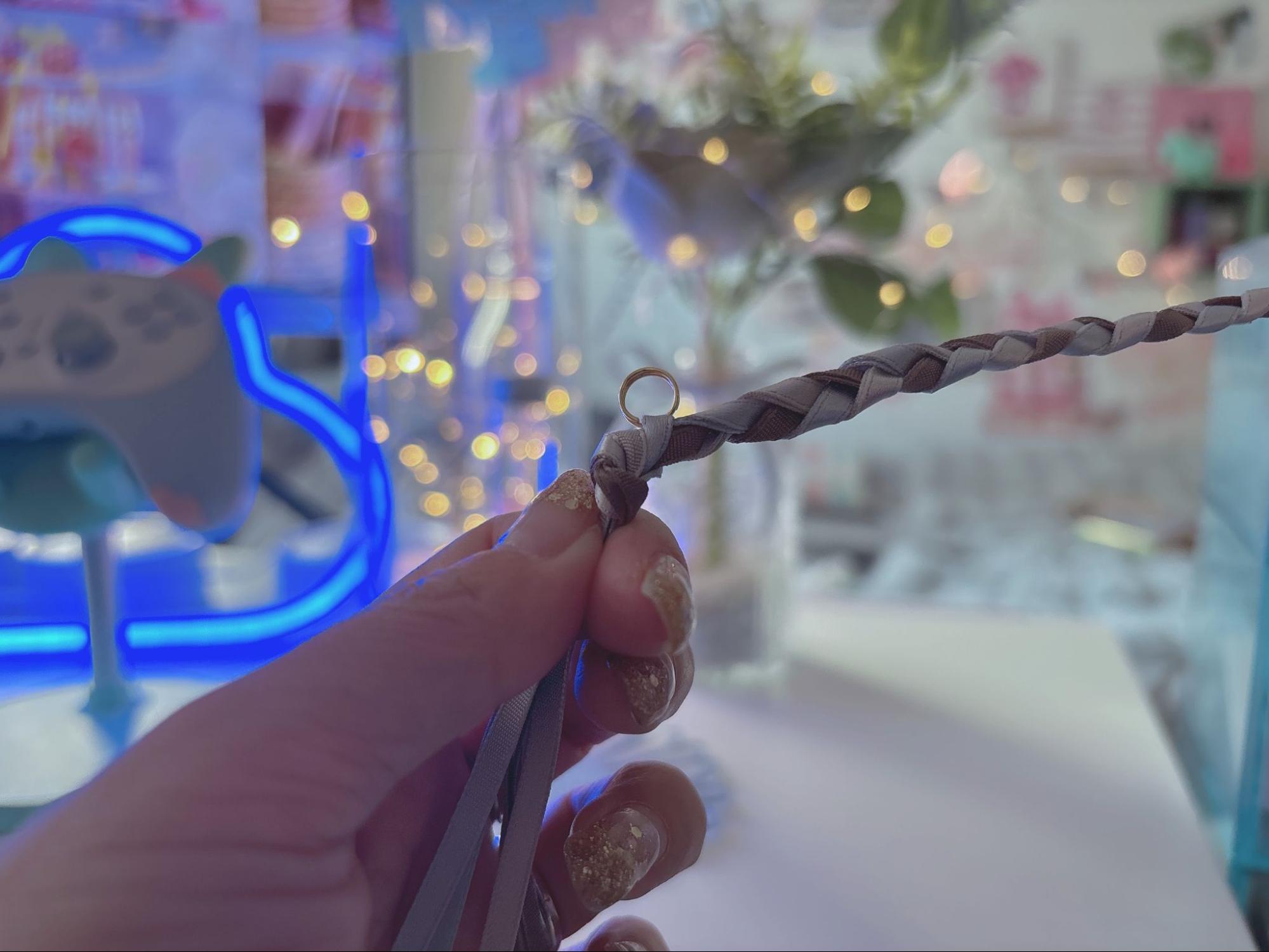 - 画像のようにリボン3色を持って、三つ編みしていきます。