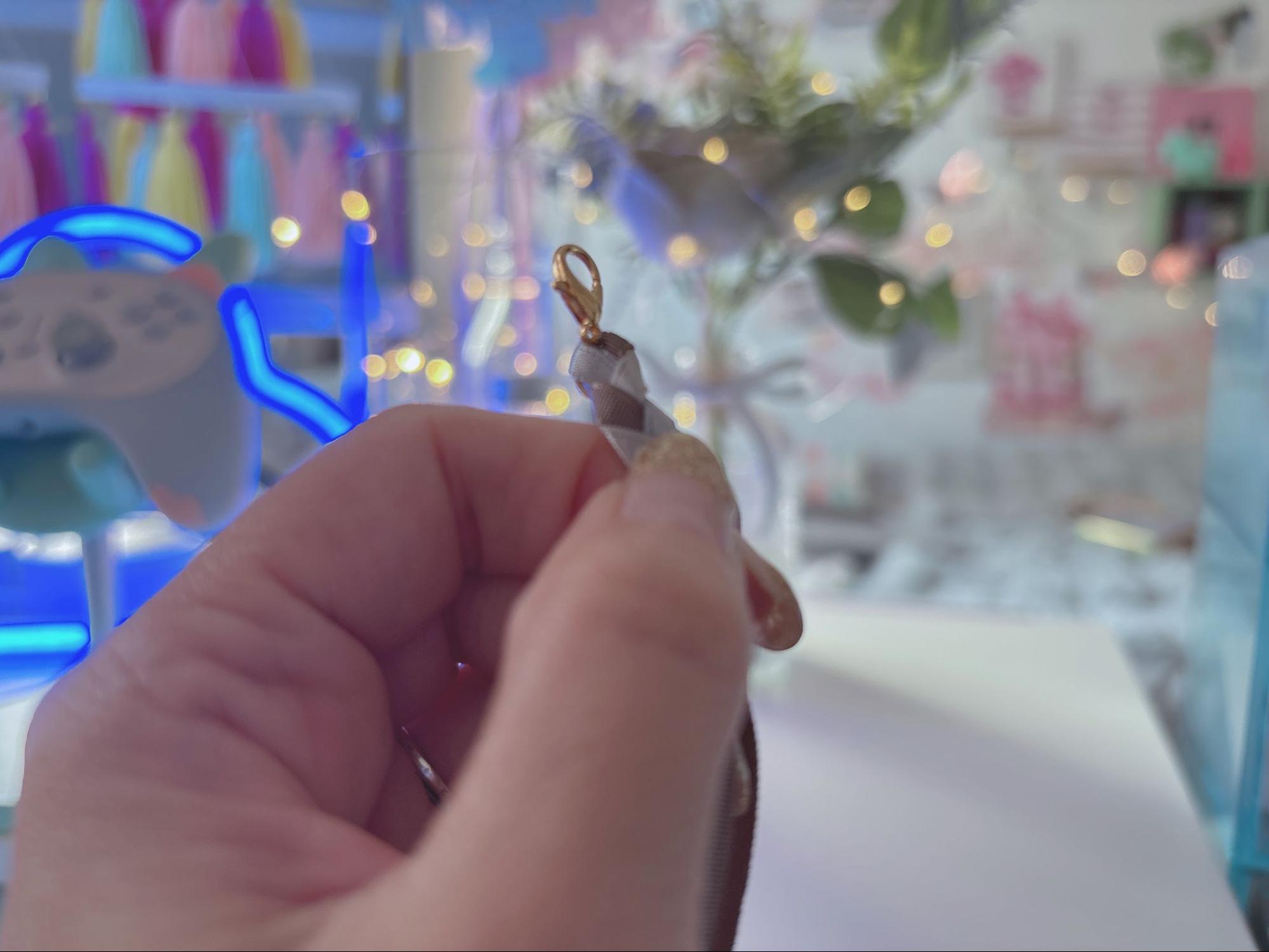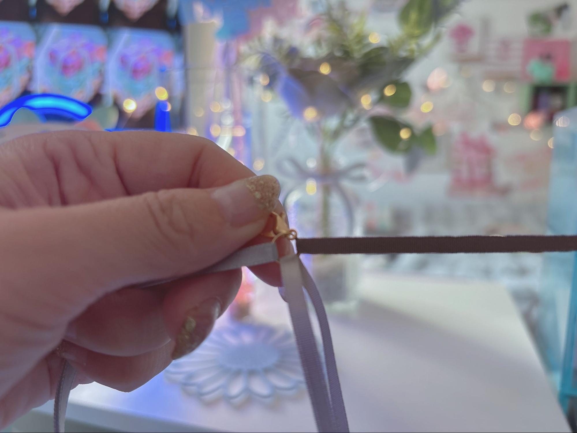 - そのままリボンをグーっと通して、リボンの半分のところに金具が来るようにリボンを通します。