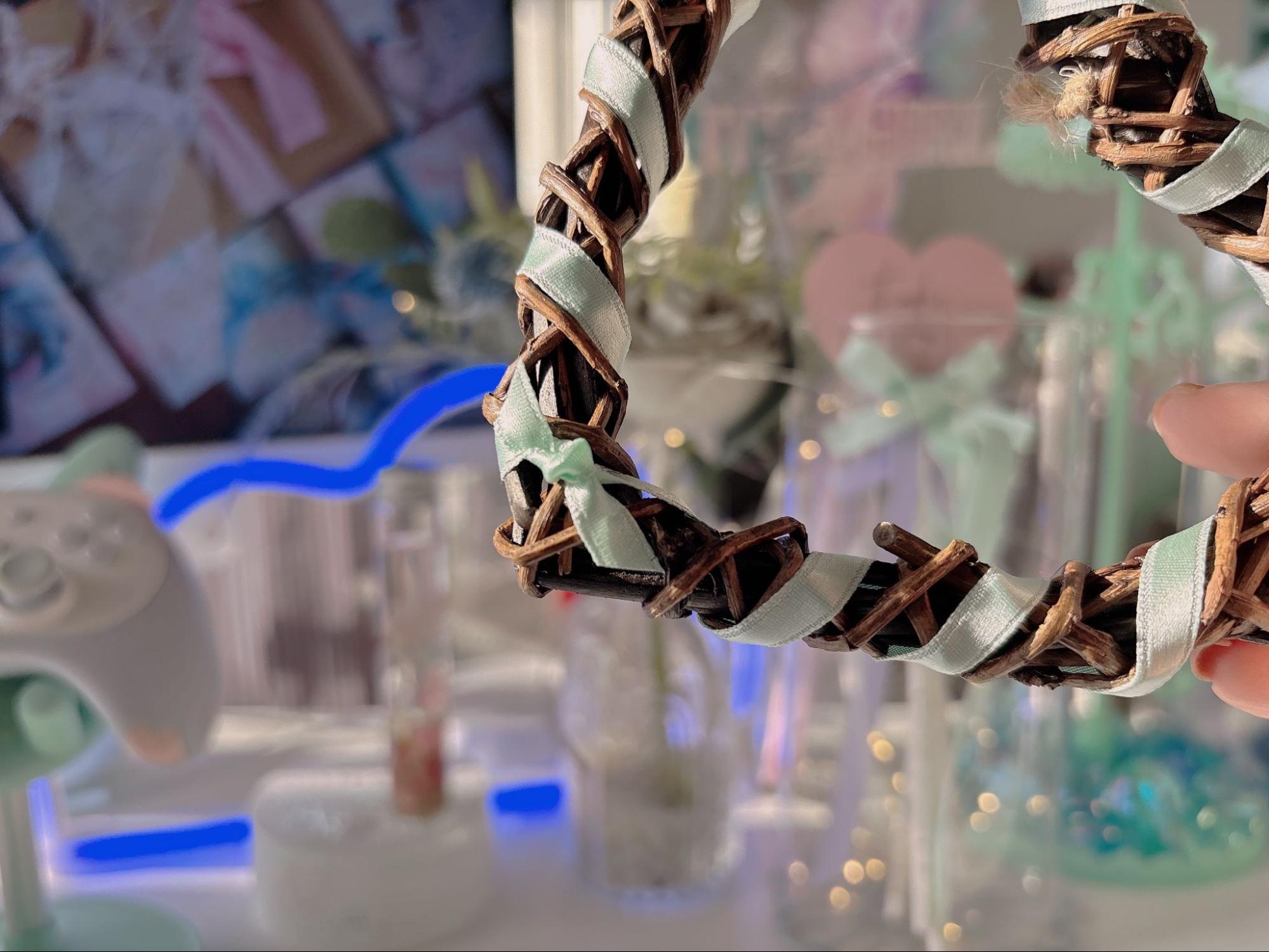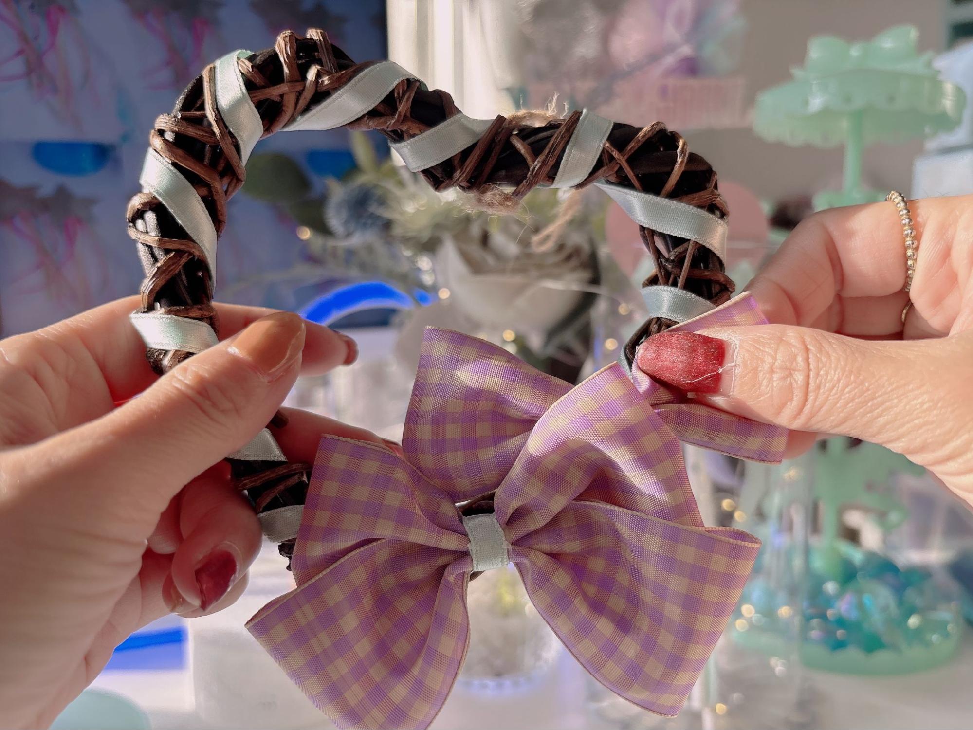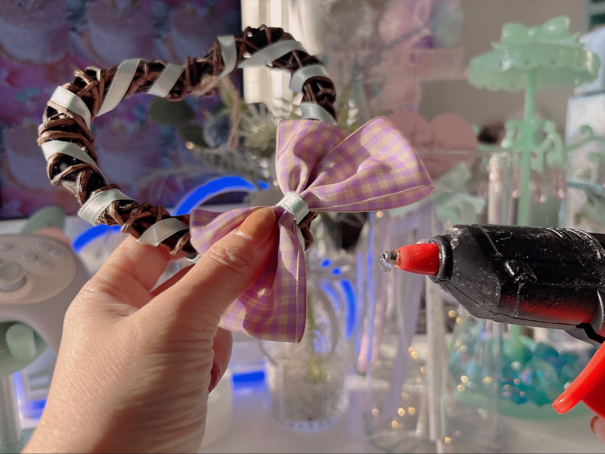 - リースにリボンをデコレーションしていきます。一番大きなものをメインでその位置にするか決めて、グルーで固定していきます。