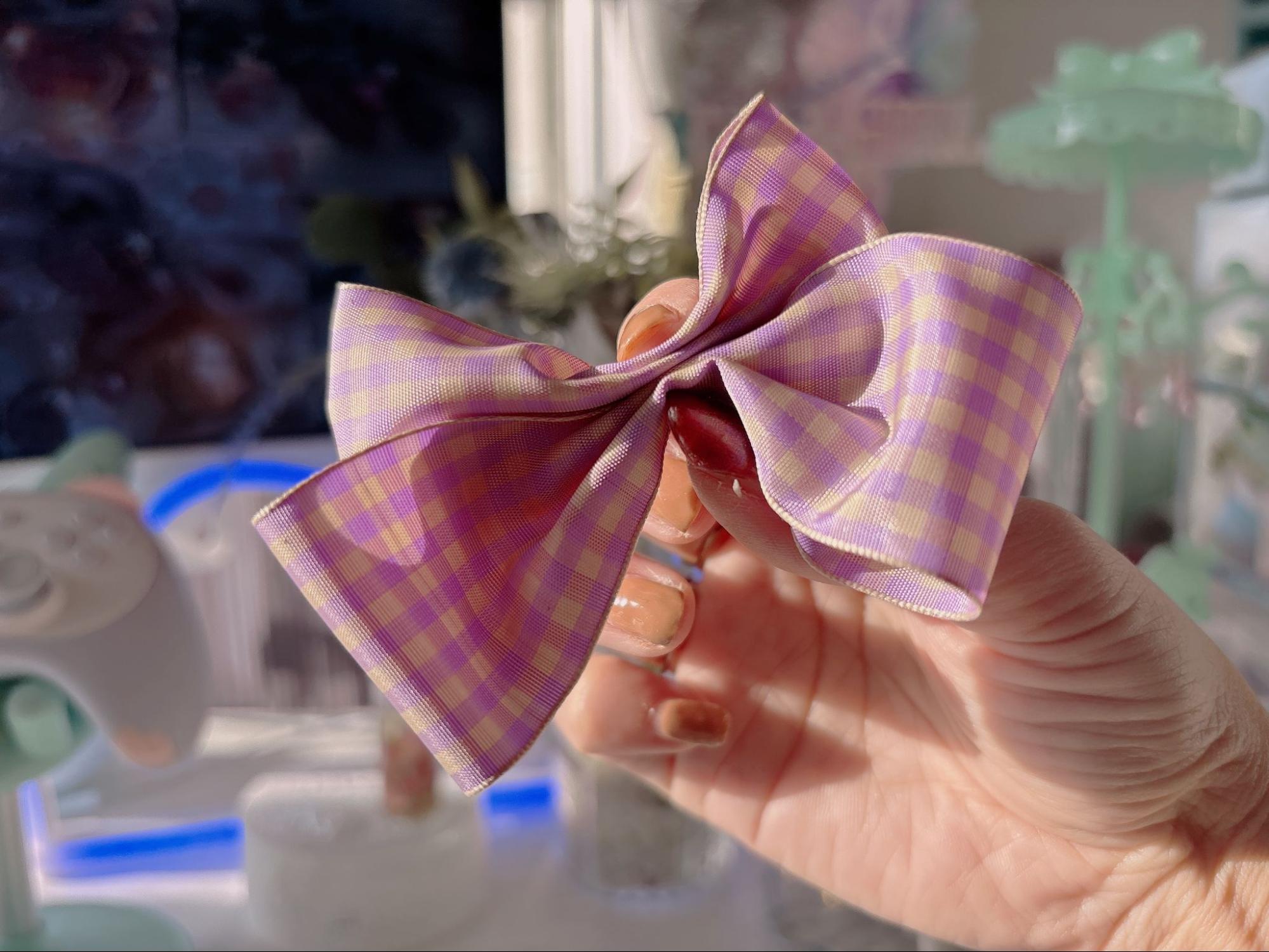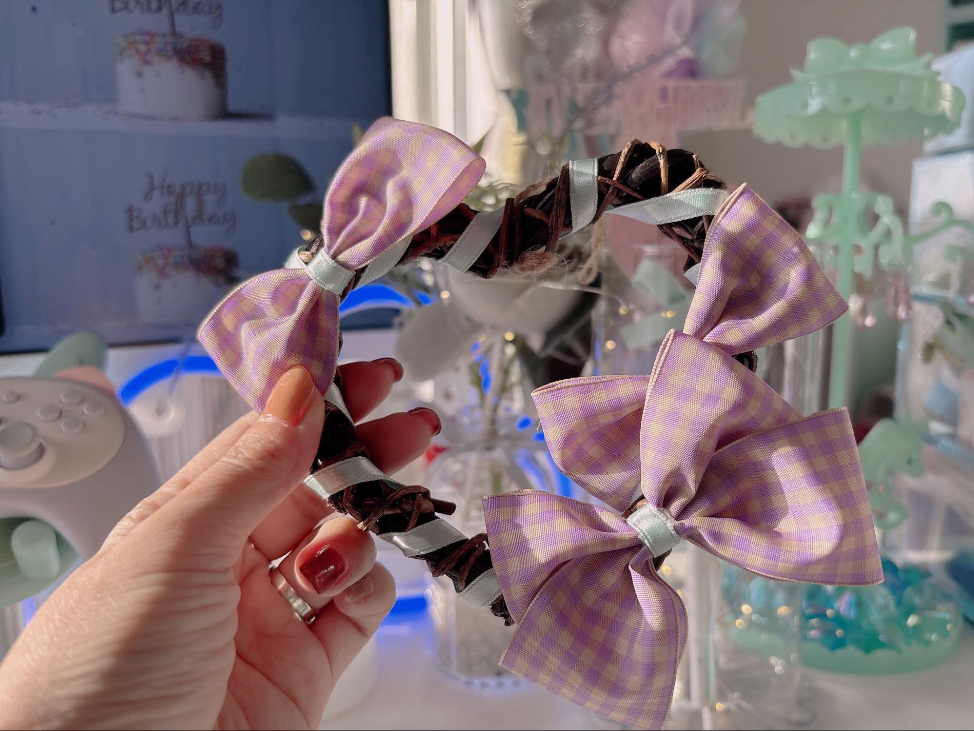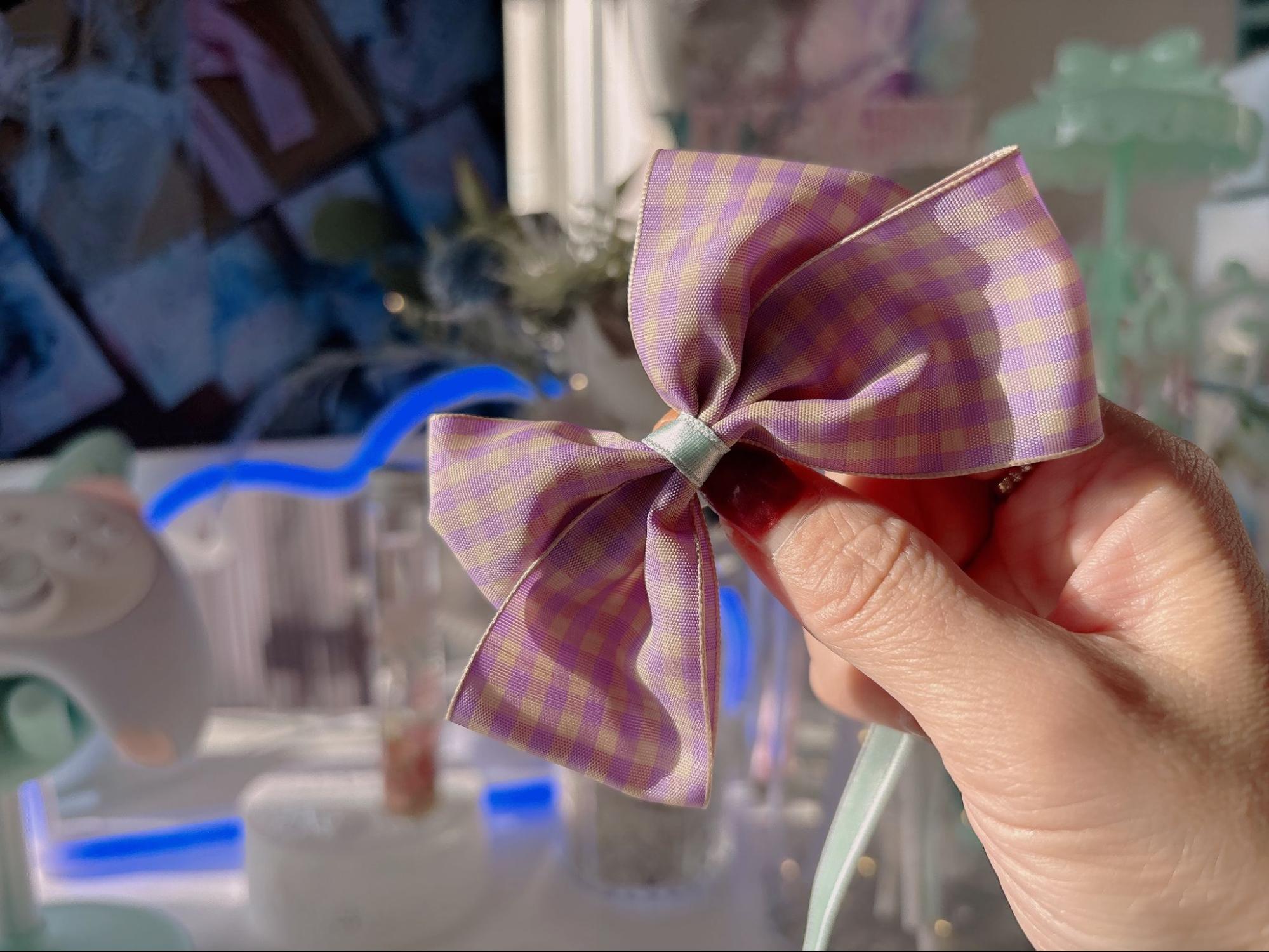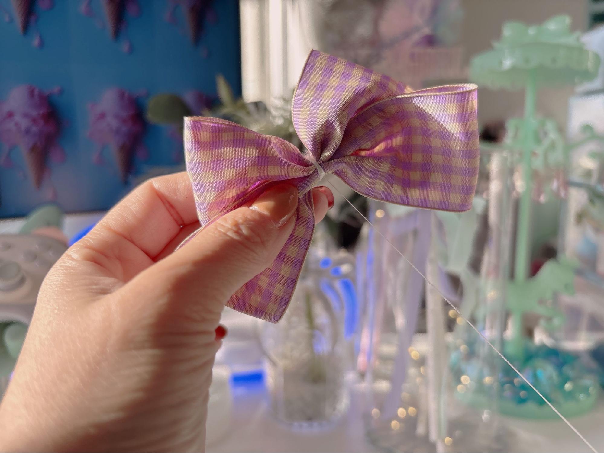 - 20cmにカットしたチェックタフタリボンを2つ、それぞれ輪にしていきます。リボンを2つ作ります。