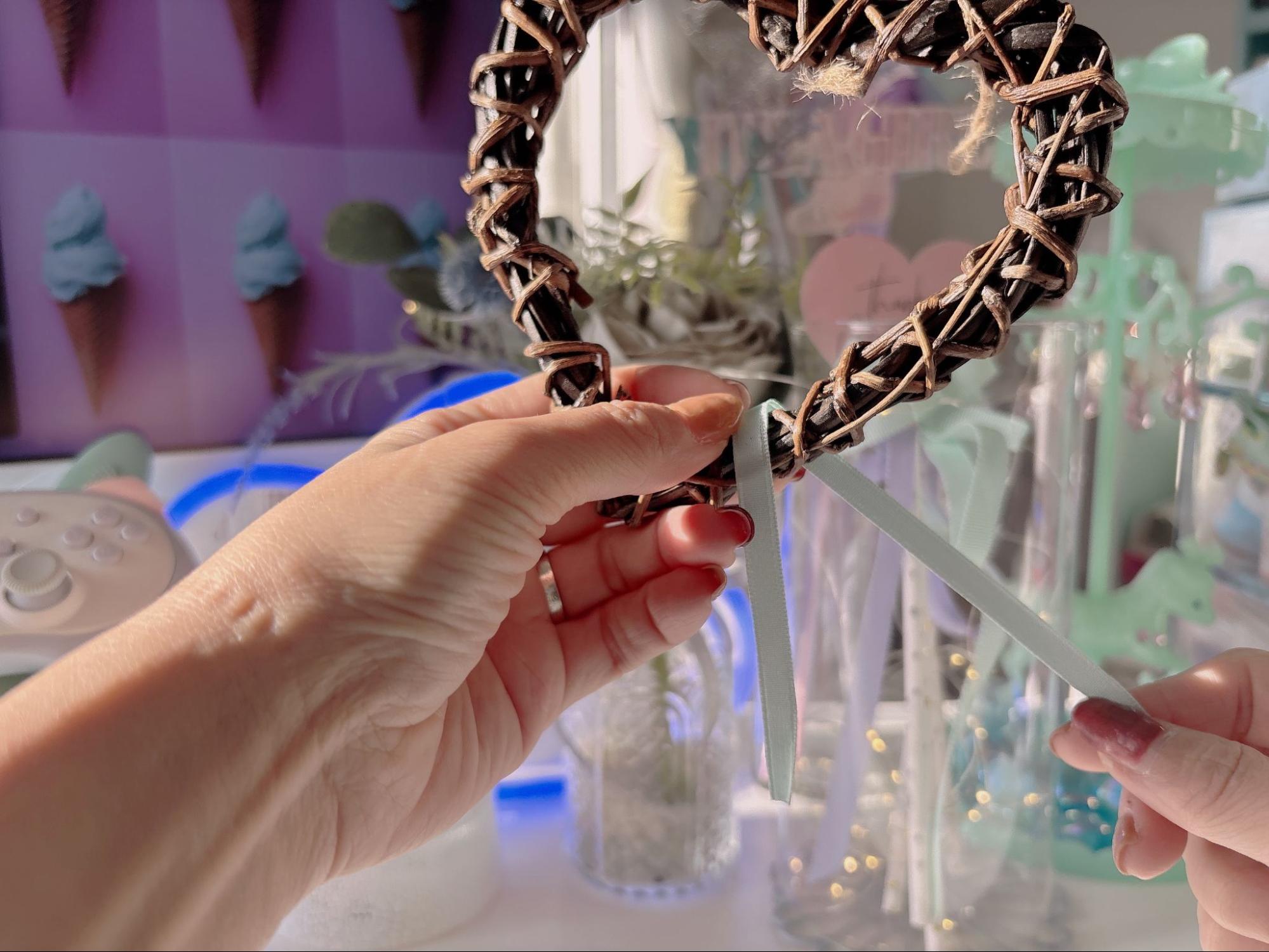- ハートのリースに、シルクシングルサテンリボンをぐるぐる巻きつけていきます。