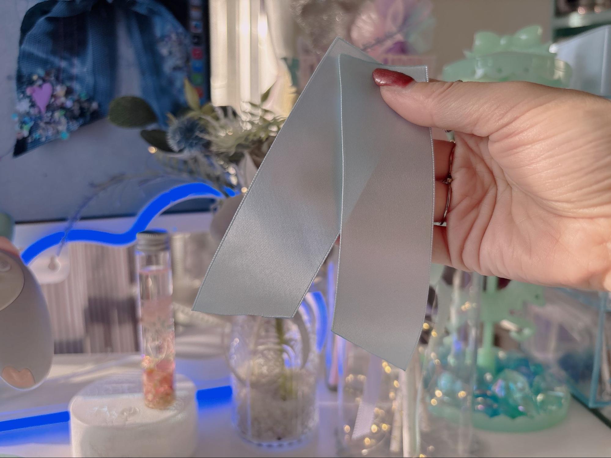 - シングルサテンリボンの7cmカットしたものを、縦に両端を画像のように折り込みます。