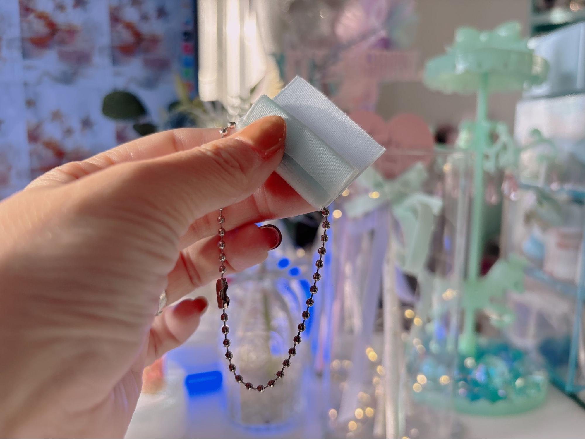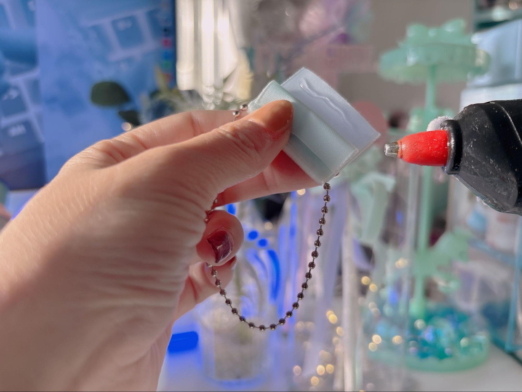 - ボールチェーンを取り出します。ベルベットリボンの7cmカットしたものを間に通すようにして、挟み込みます。グルーで根元は固定してしまいます。