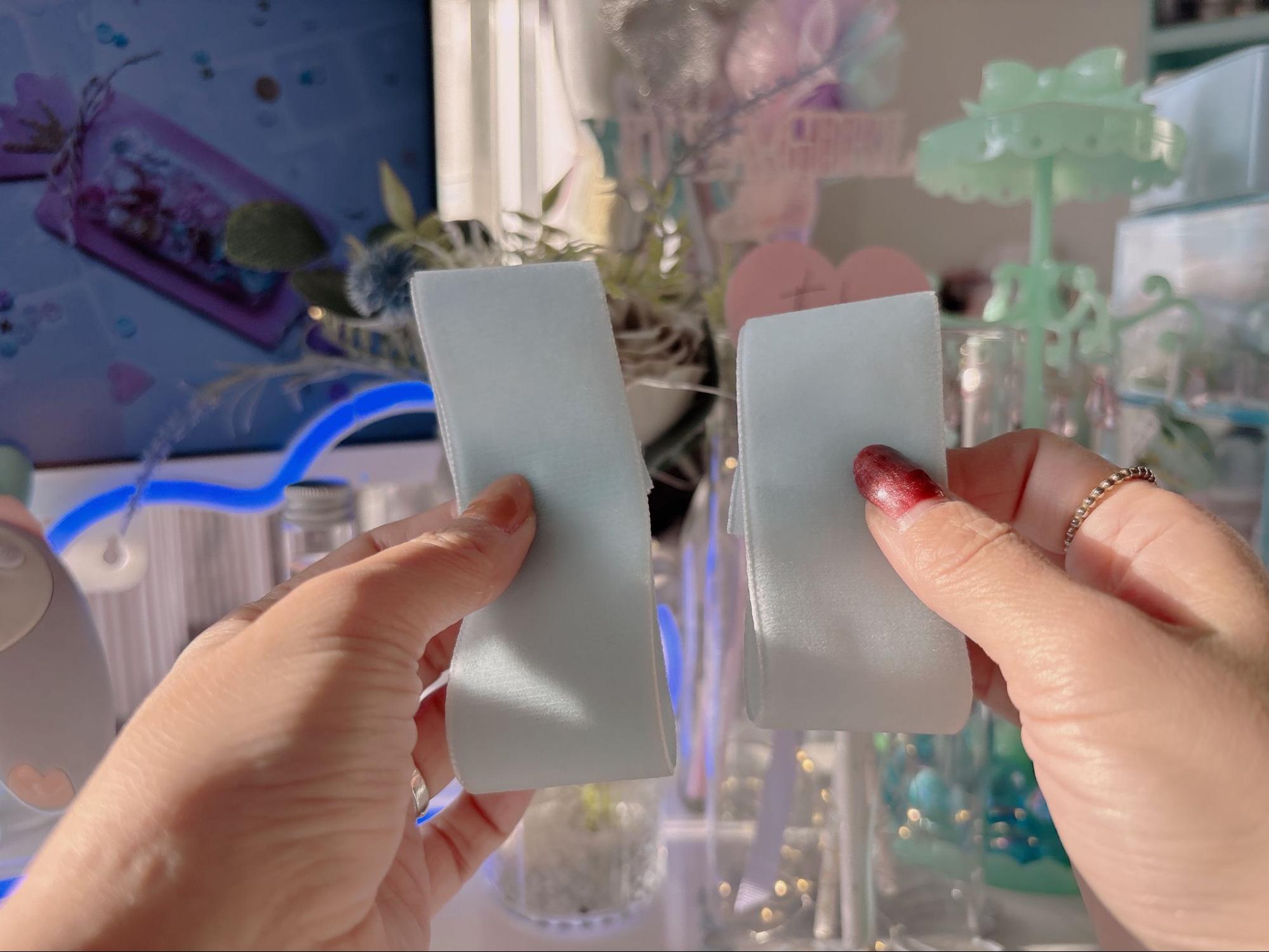 - シングルサテンリボン15cmカット2本とシングルナイロンベルベットリボンの12cmカット2本をそれぞれ画像のように重ねます。重なり合うところはグルーで固定します。