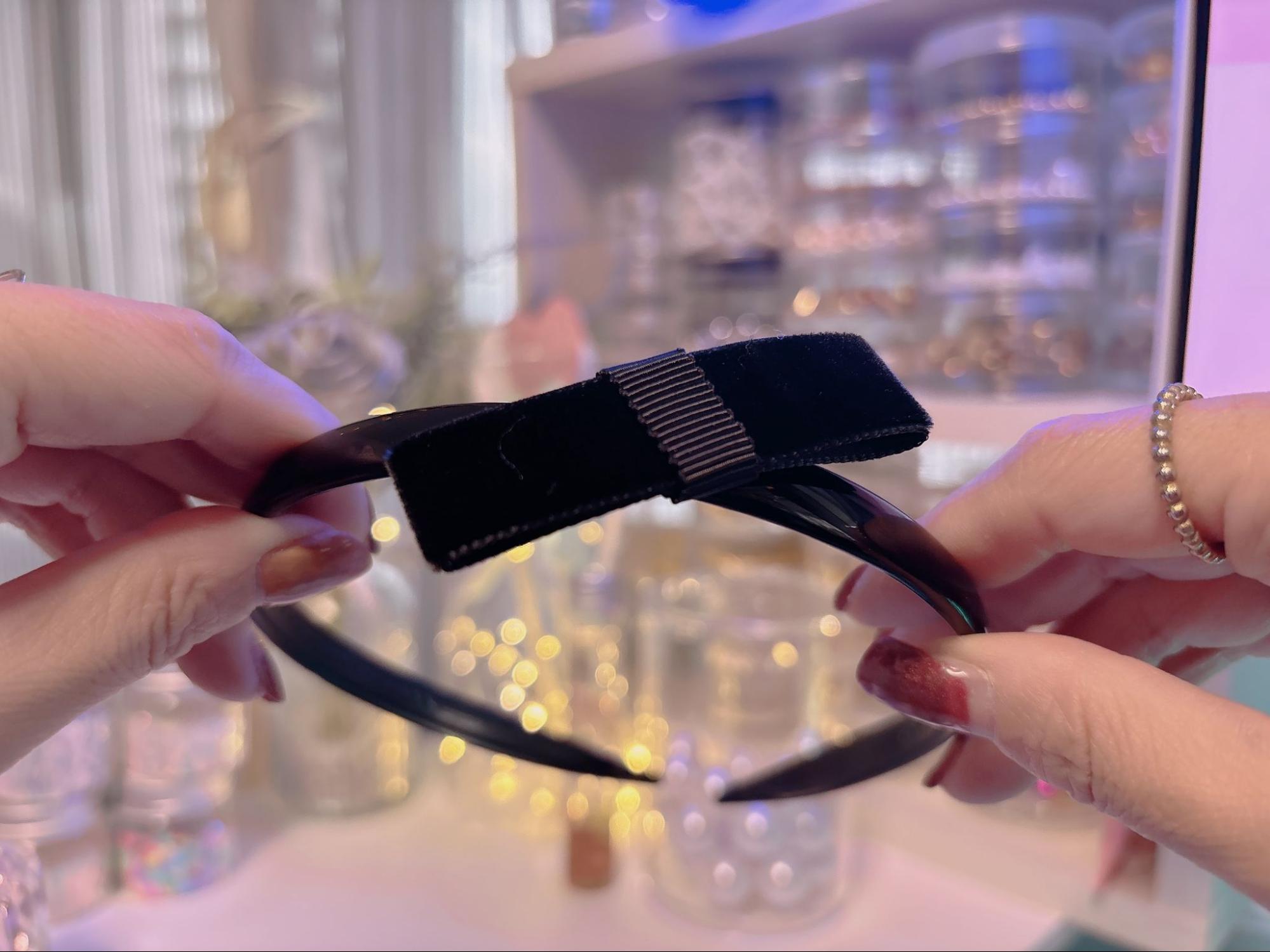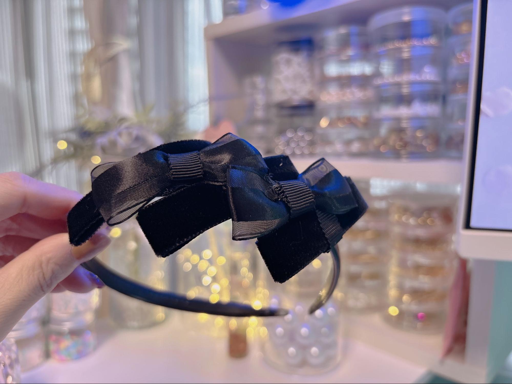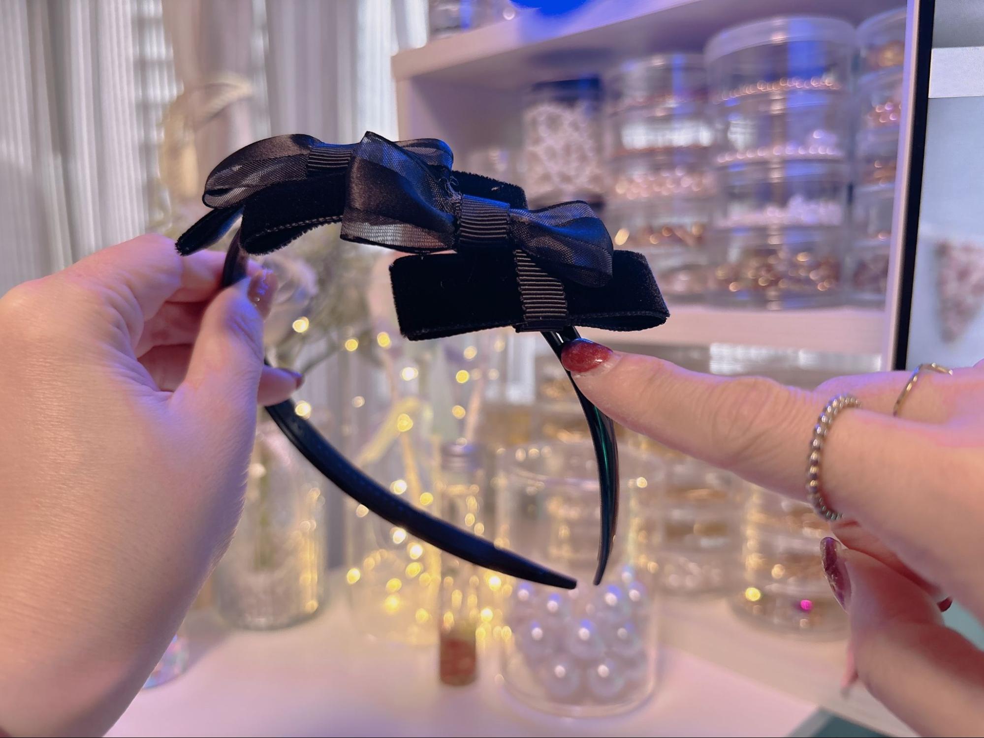 - カチューシャにリボンを接着していきます。まずはベルベットリボンの方を三つ固定していきます。てっぺんより少しカーブ寄りに、5mmずつ幅を開けながらずらしてグルーで貼り付けます。