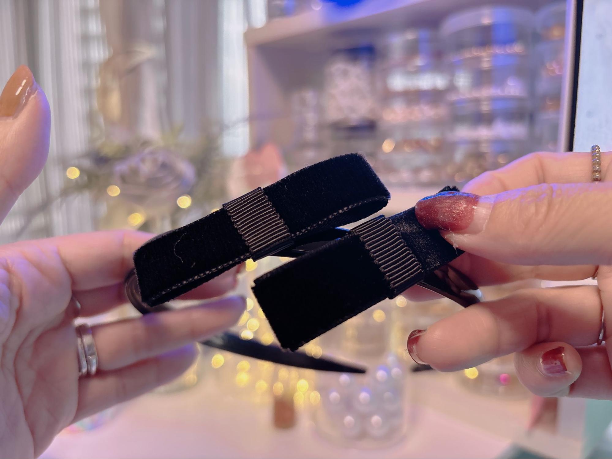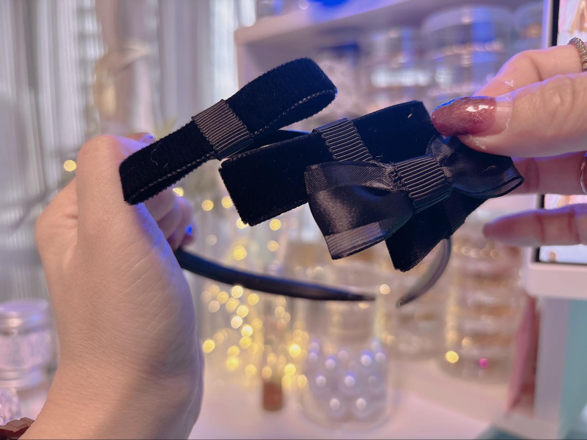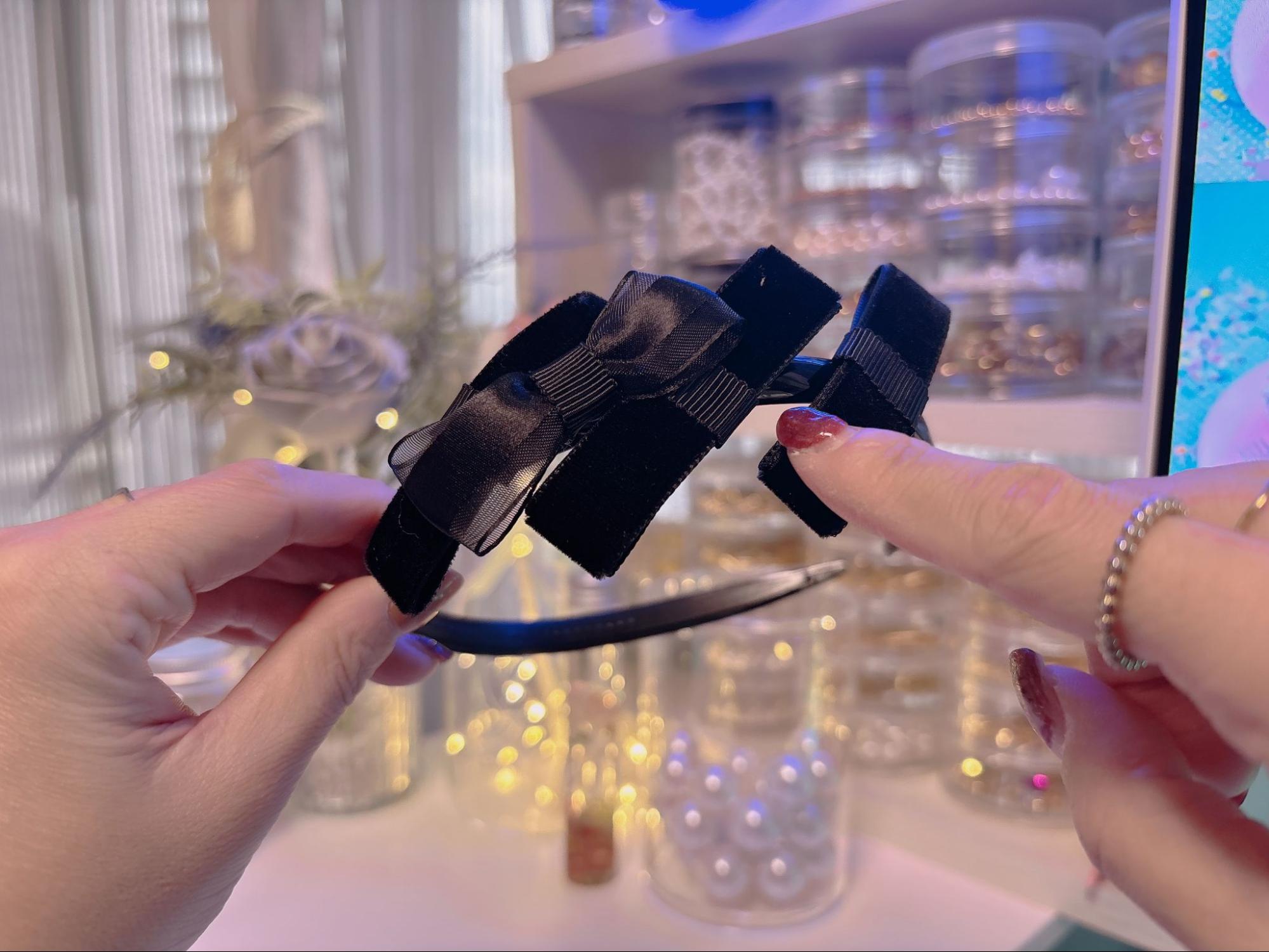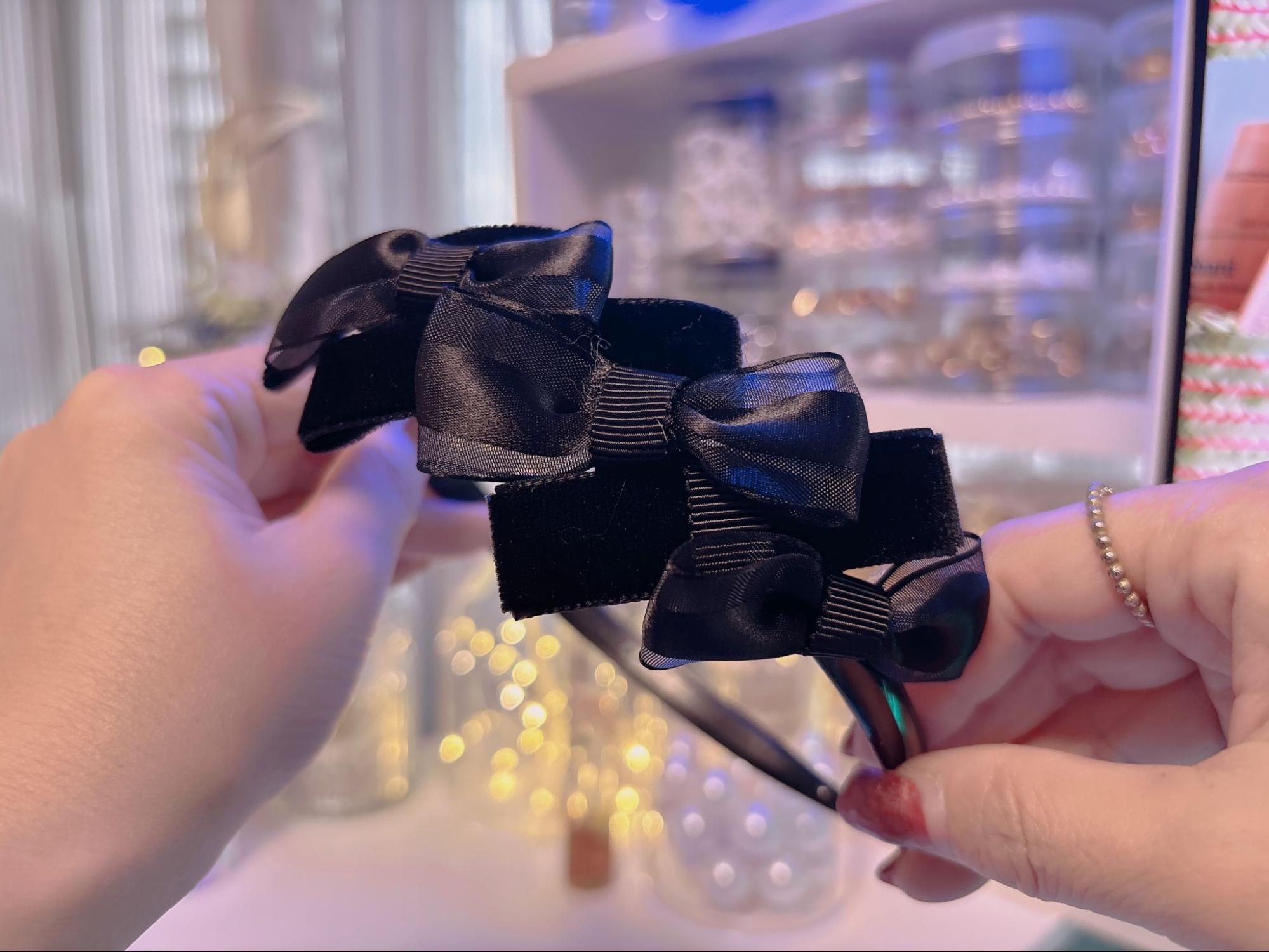 - カチューシャにリボンを接着していきます。まずはベルベットリボンの方を三つ固定していきます。てっぺんより少しカーブ寄りに、5mmずつ幅を開けながらずらしてグルーで貼り付けます。