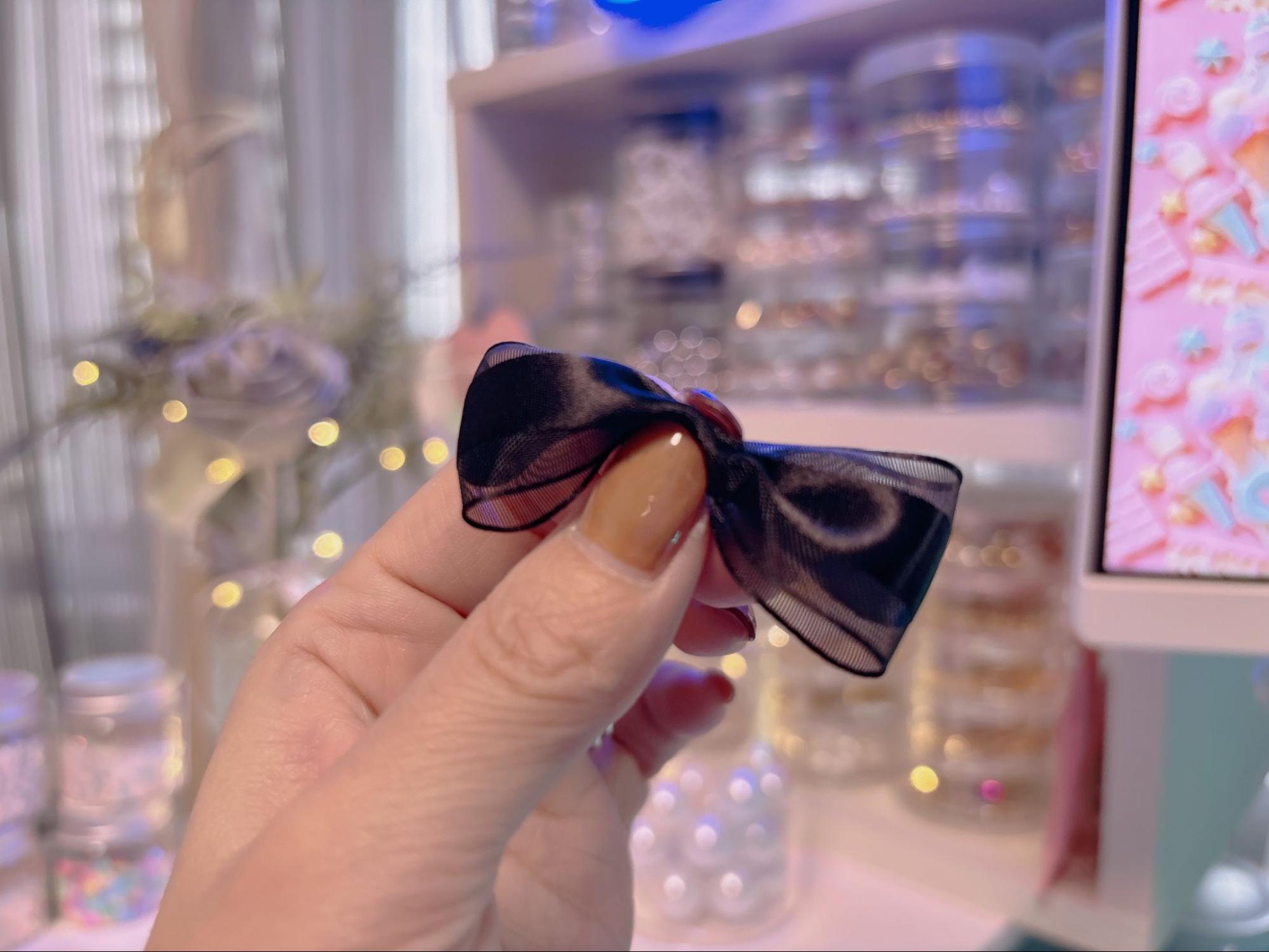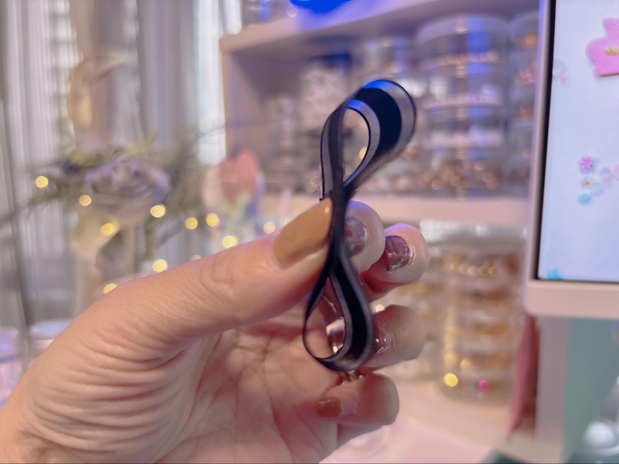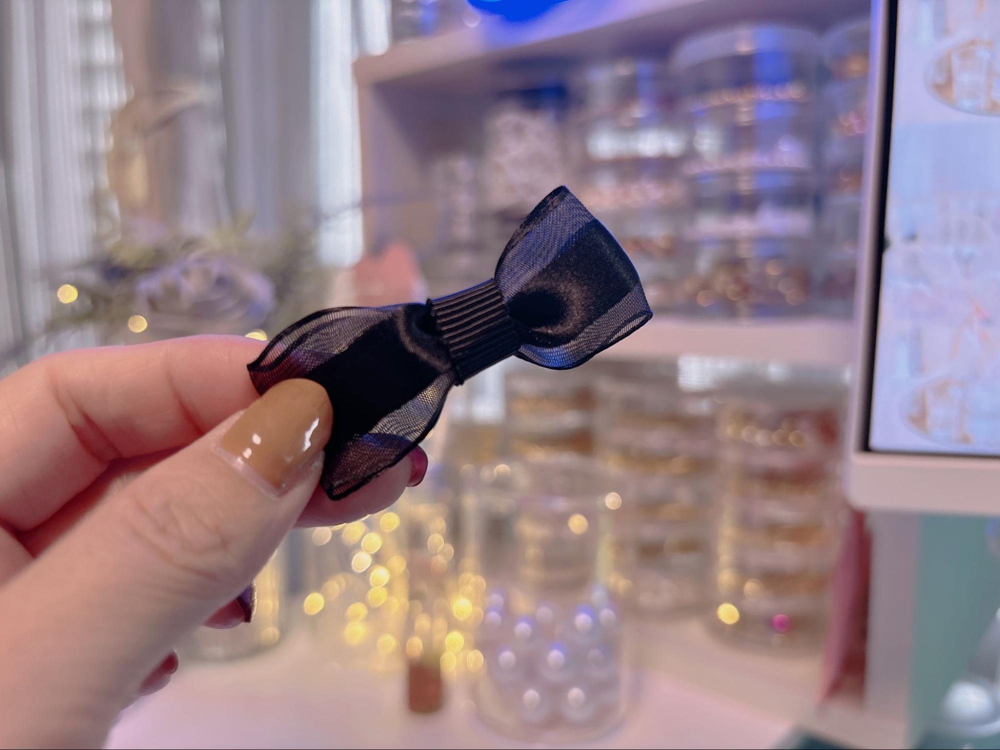 - ポリエステルペタシャムリボンをグルーでとめながら巻きつけてカットし、リボンを仕上げます。