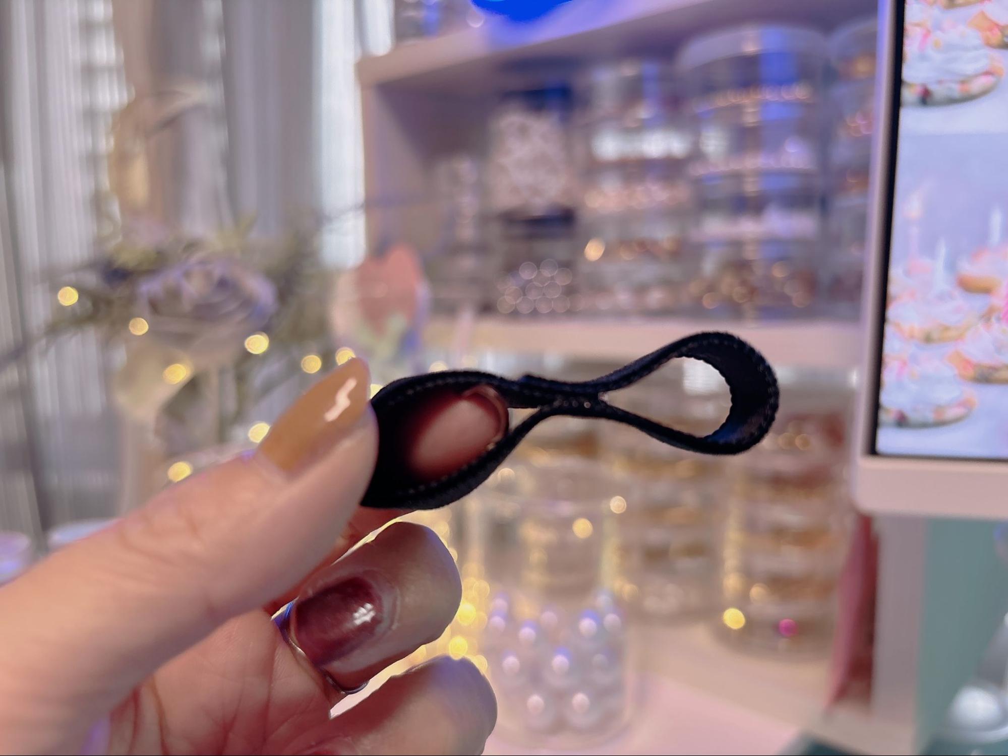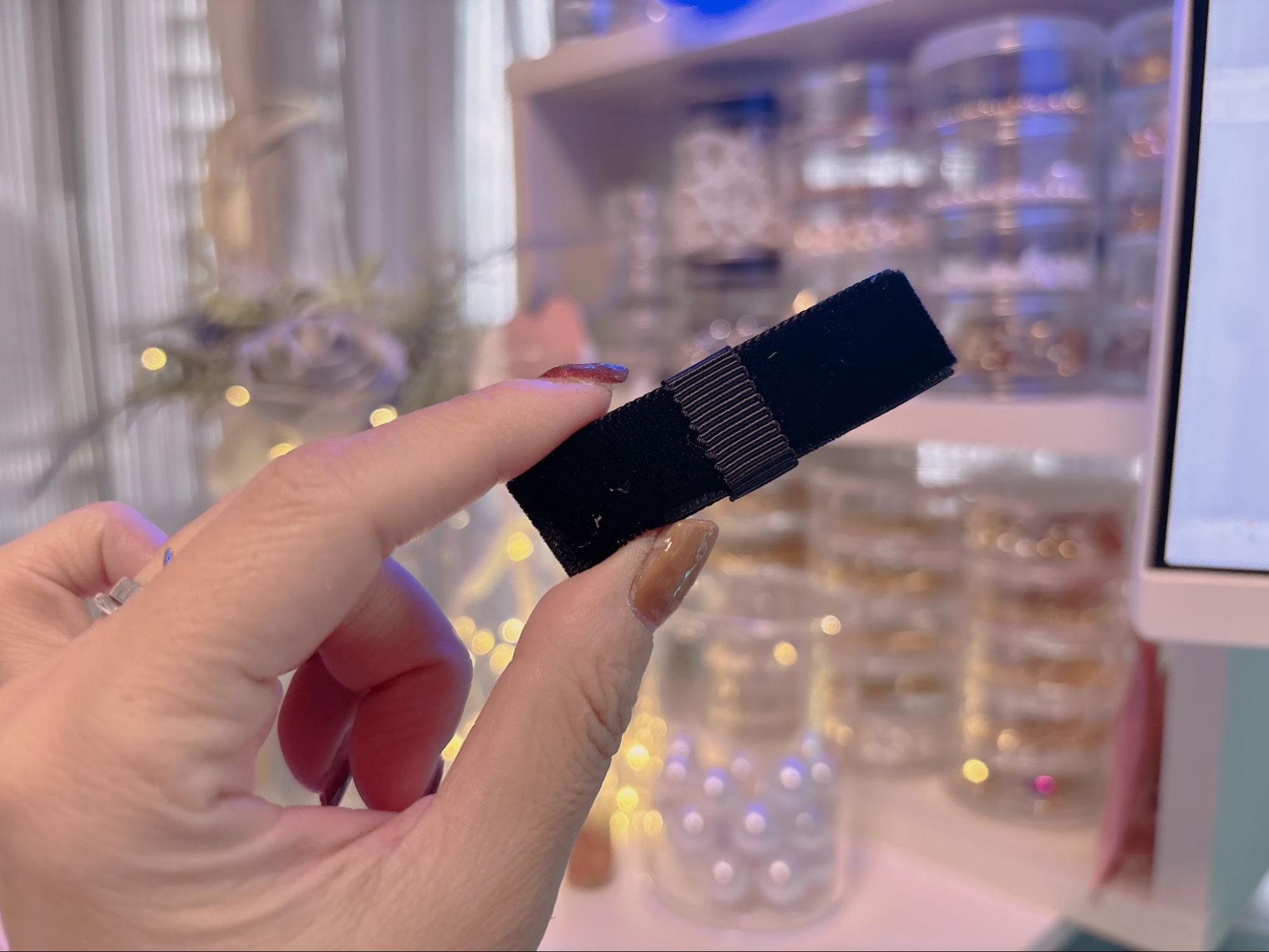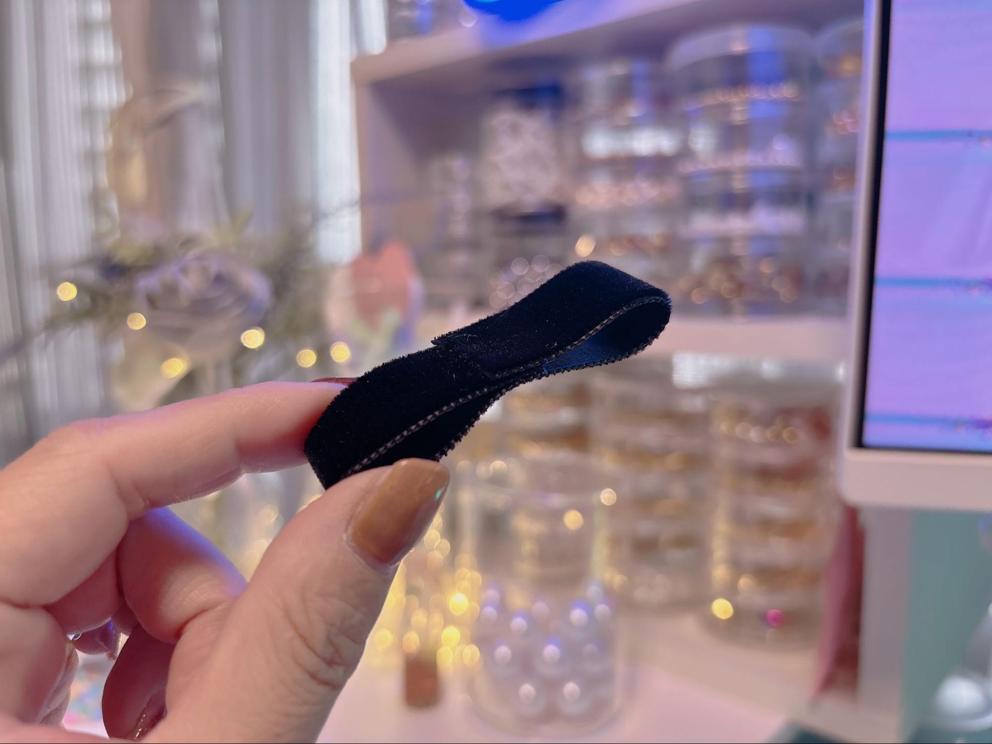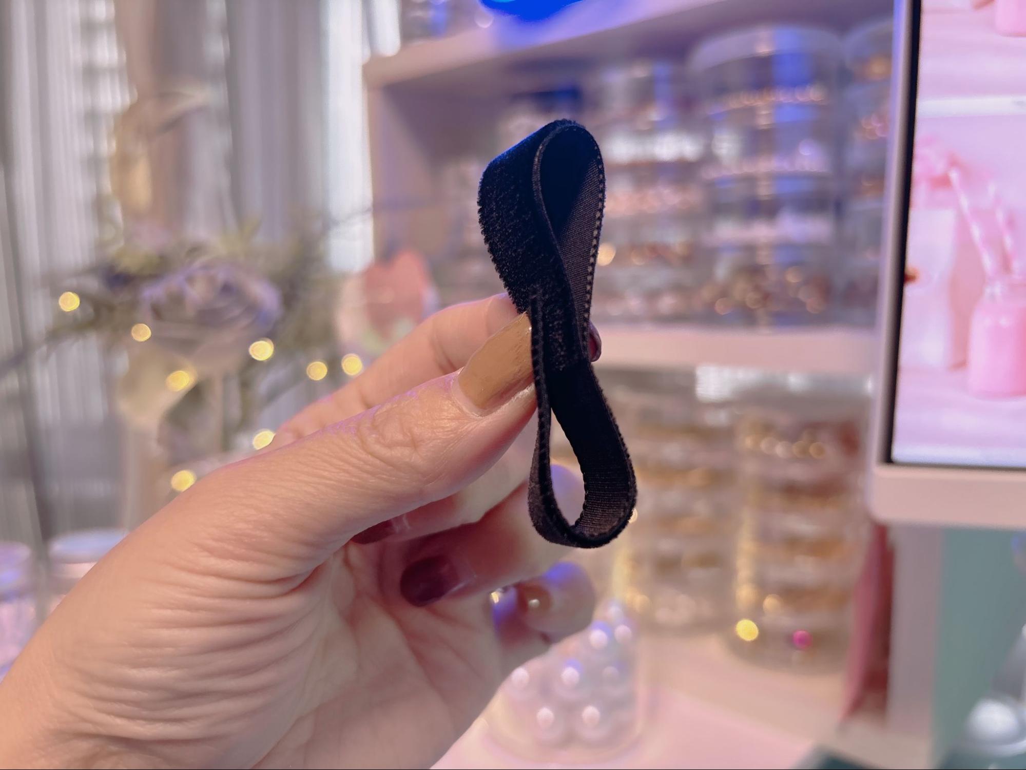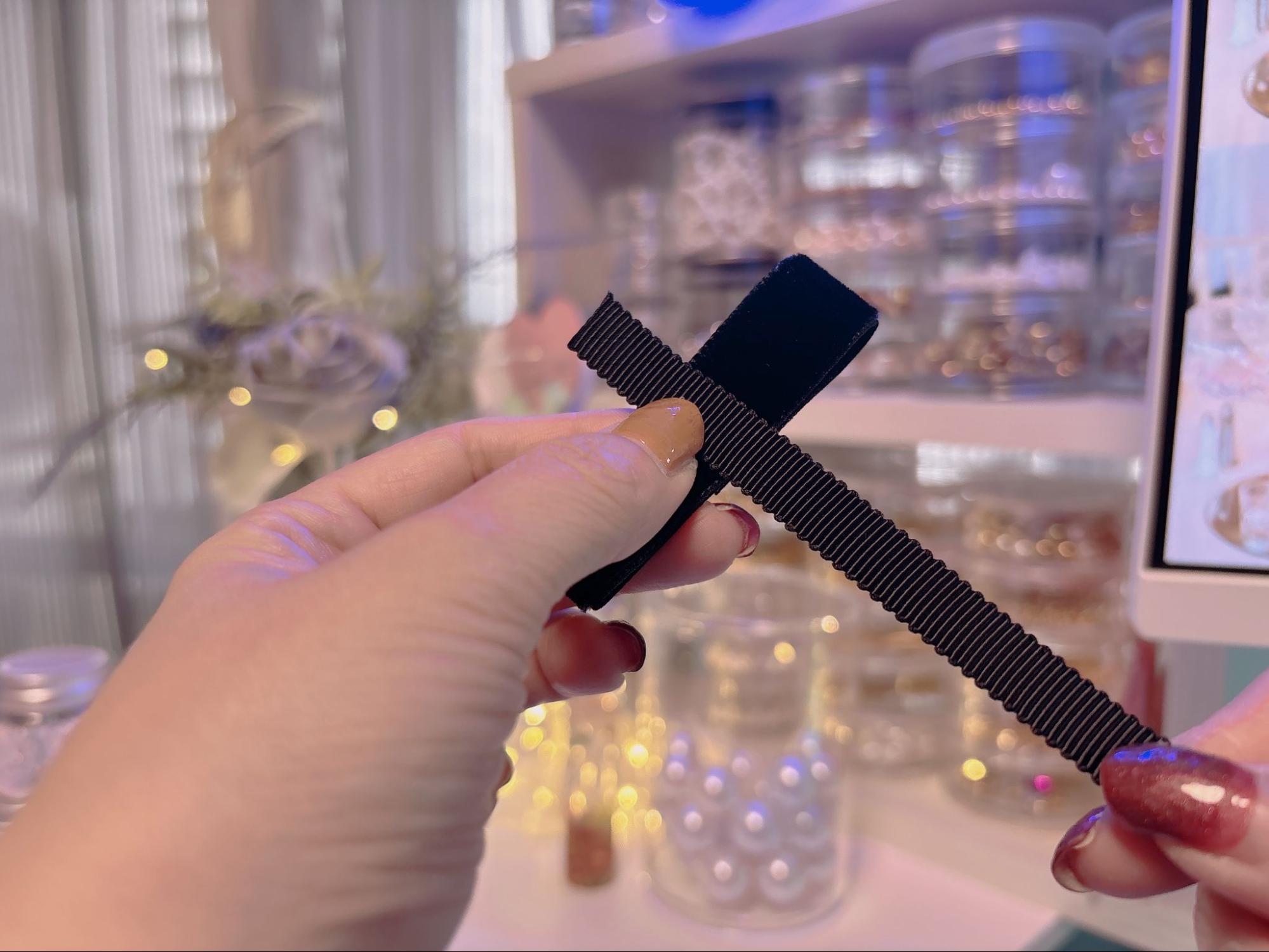 - シングルナイロンベルベットリボンの12cmカットしたものを輪にして、中央をグルーで固定します。