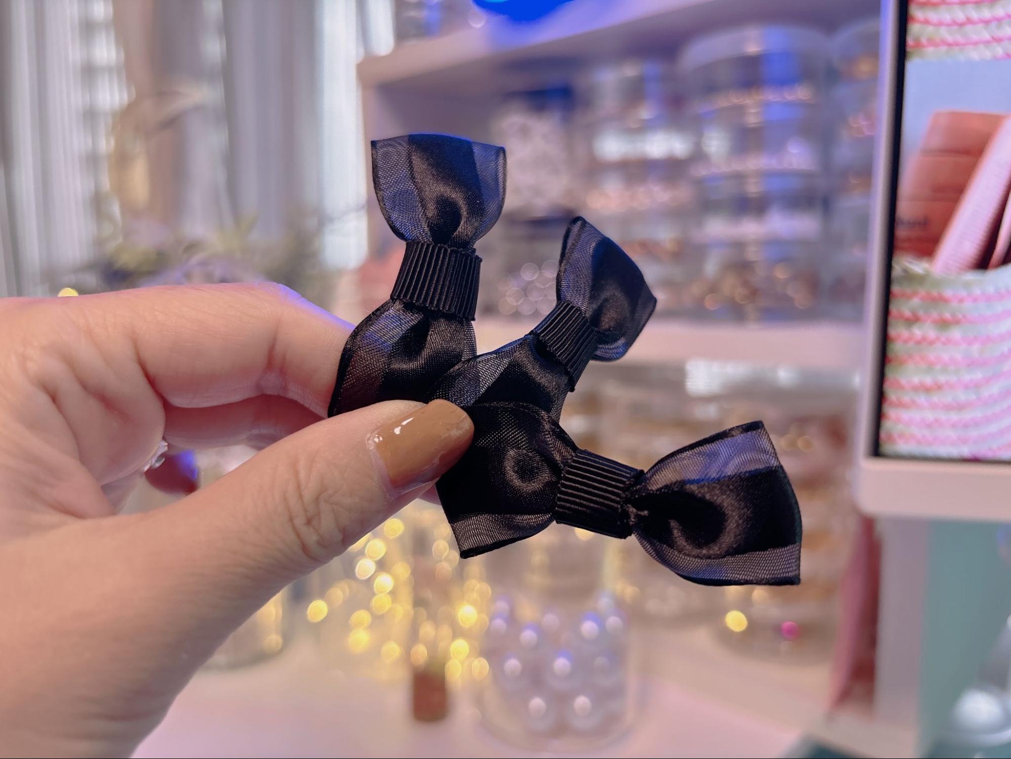 - ポリエステルペタシャムリボンでリボン中央を巻いてグルーでとめ、リボンを仕上げます。同じく三つ仕上げます。